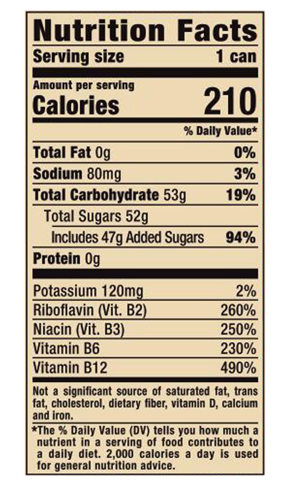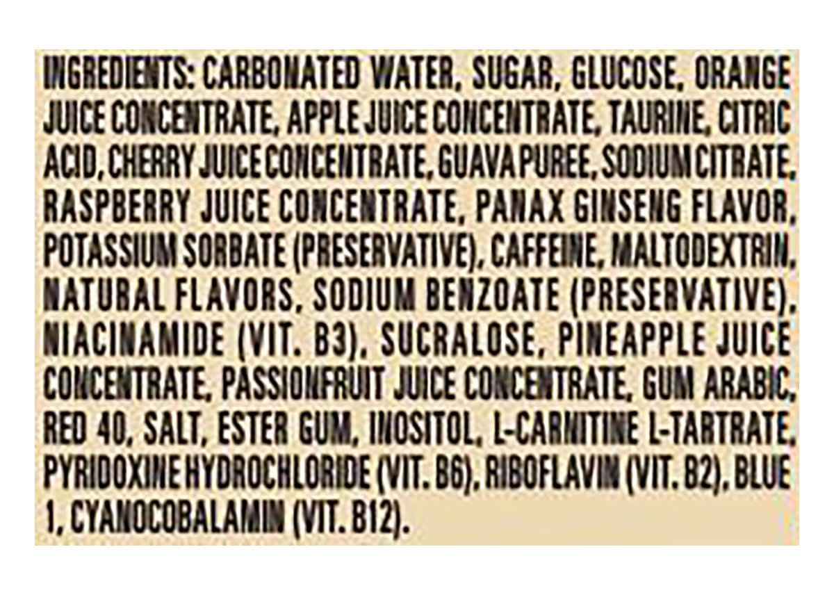 Ingredients: Carbonated Water, Sugar, Glucose, Orange Juice Concentrate, Apple Juice Concentrate, Taurine, Citric Acid, Cherry Juice Concentrate, Guava Puree, Sodium Citrate, Raspberry Juice Concentrate, Panax Ginseng Flavor, Potassium Sorbate (Preservative), Caffeine, Maltodextrin, Natural Flavors, Sodium Benzoate (Preservative), Niacinamide (Vit. B3), Sucralose, Pineapple Juice Concentrate, Passionfruit Juice Concentrate, Gum Arabic, Red 40, Salt, Ester Gum, Inositol, L-Carnitine L-Tartrate, Pyridoxine Hydrochloride (Vit. B6), Riboflavin (Vit. B2), Blue 1, Cyanocobalamin (Vit. B12) Contains 160mg of caffeine