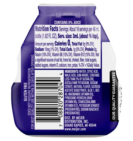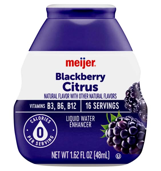 Meijer's Blackberry Citrus Liquid Water Enhancer transforms your water with a delightful burst of flavor. Enriched with vitamins B3, B6, and B12, this zero-calorie enhancer makes hydration enjoyable without adding to your calorie count. Flavor: Blackberry citrus