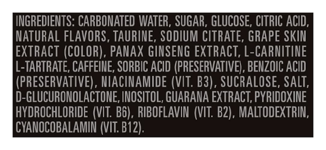 Ingredients: Carbonated Water, Sugar, Glucose, Citric Acid, Natural Flavors, Taurine, Sodium Citrate, Grape Skin Extract (Color), Panax Ginseng Extract, L-Carnitine L-Tartrate, Caffeine, Sorbic Acid (Preservative), Benzoic Acid (Preservative), Niacinamide (Vit. B3), Sucralose, Salt, D-Glucuronolactone, Inositol, Guarana Extract, Pyridoxine Hydrochloride (Vit. B6), Riboflavin (Vit. B2), Maltodextrin, Cyanocobalamin (Vit. B12)