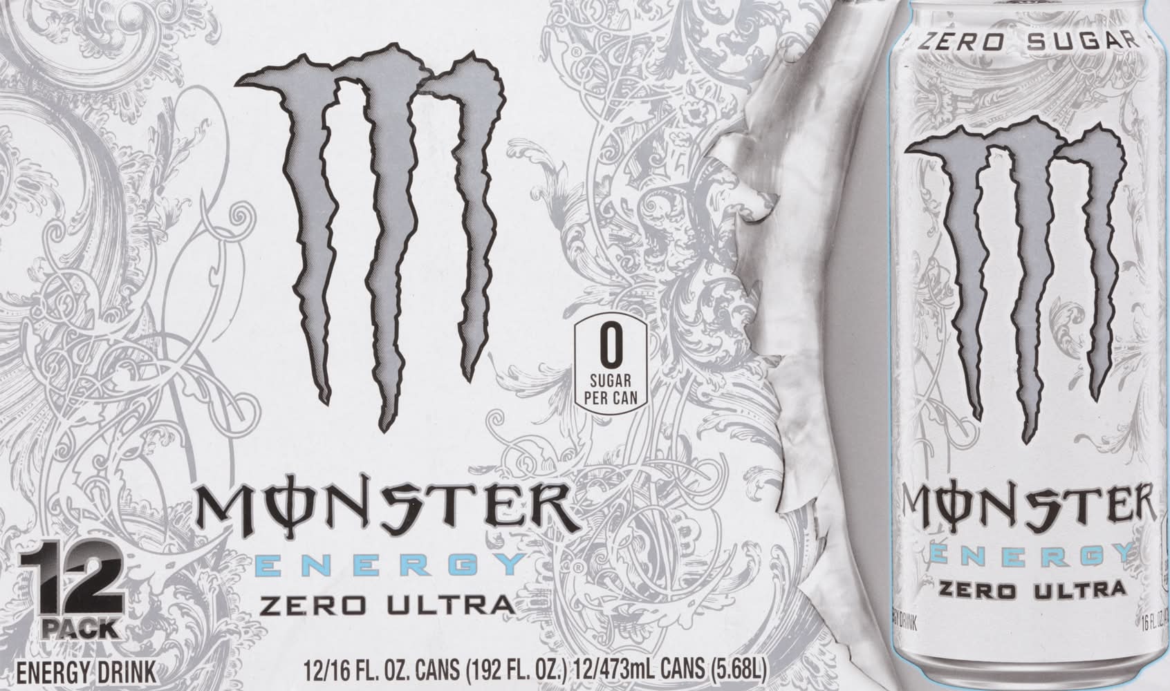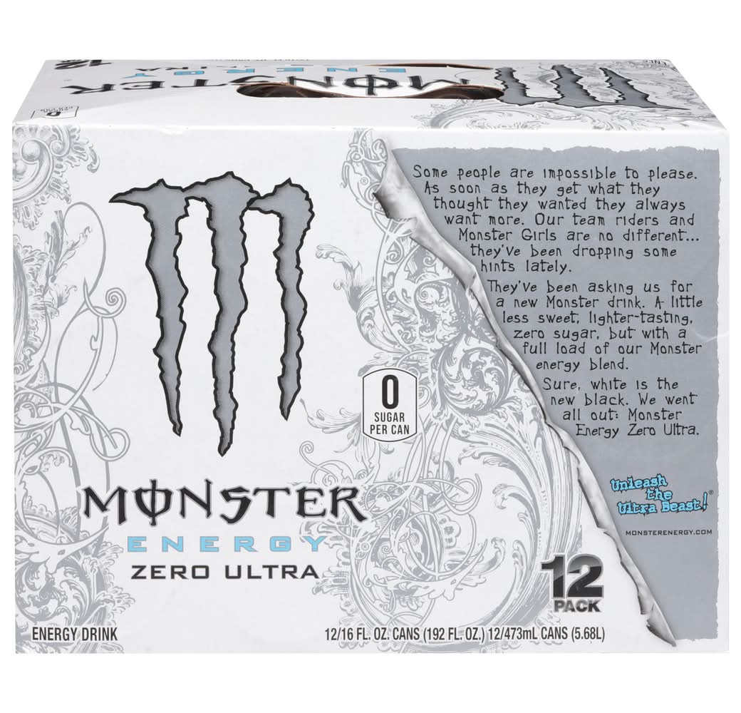 Zero Ultra a.k.a. The White Monster. Some people are impossible to please. As soon as they get what they thought they wanted they always want more. Our team riders and Monster Girls are no different? they?ve been dropping some hints lately. They?ve been asking us for a new Monster drink. Monster Zero Ultra a.k.a. the "White Monster" is zero sugar, lighter-tasting, zero calories, but with a full load of our Monster energy blend. Sure, white is the new black. We went all out: Monster Energy Zero Ultra. • Pack size: 12 • Monster Energy Company, 1 Monster Way, Corona, CA, 92879 • Packaging: Reusable