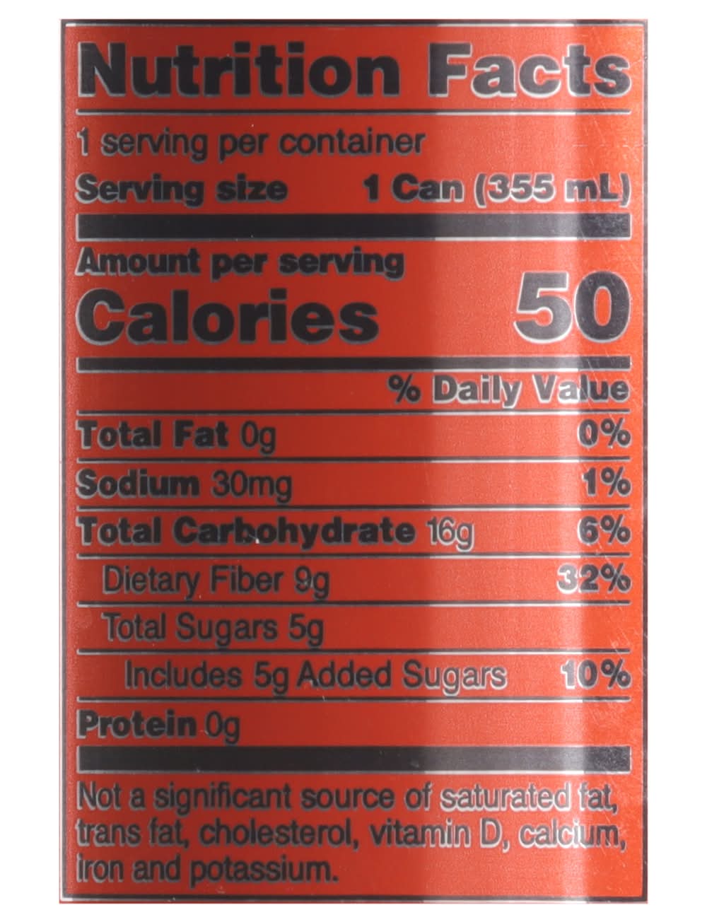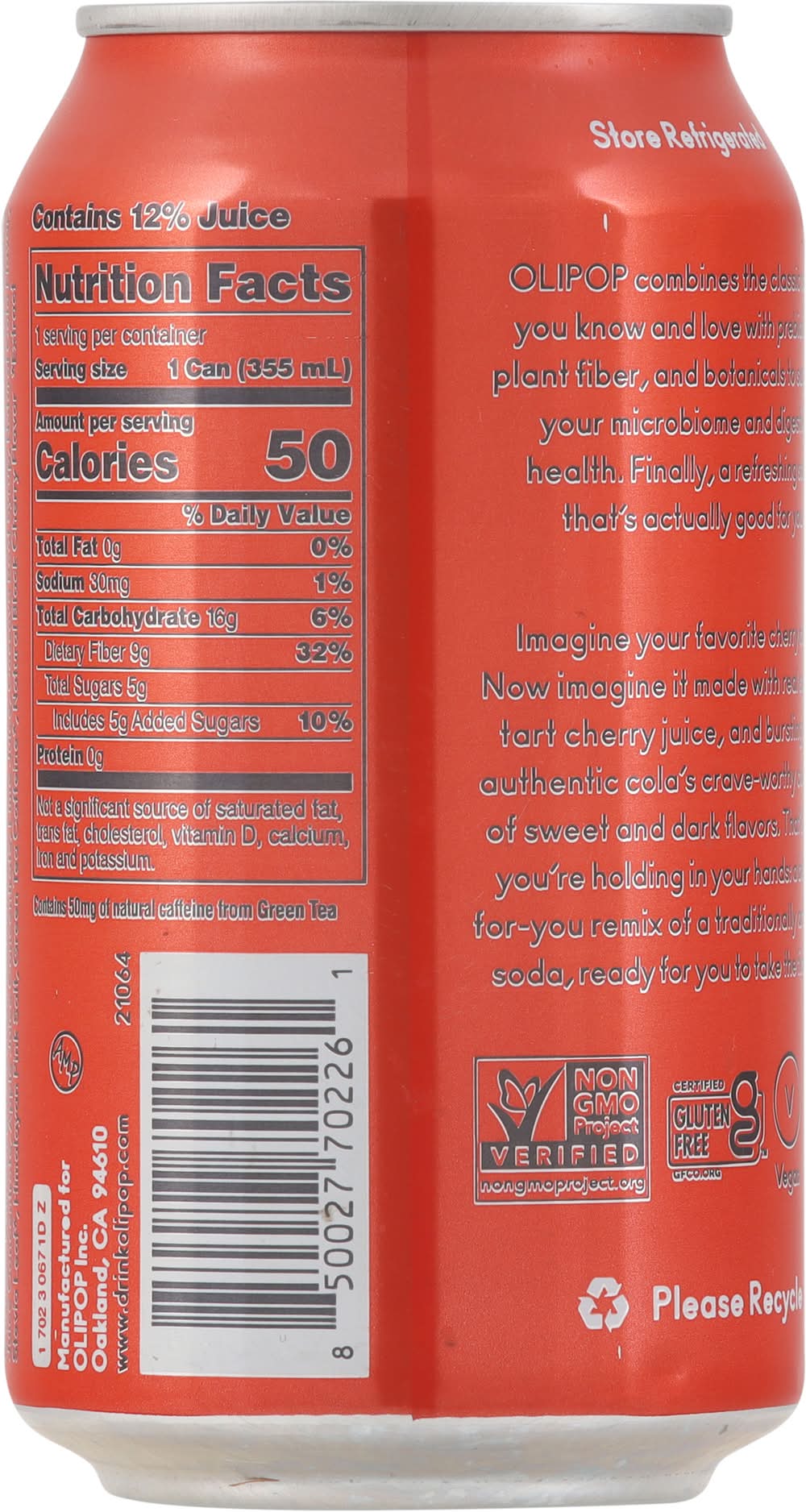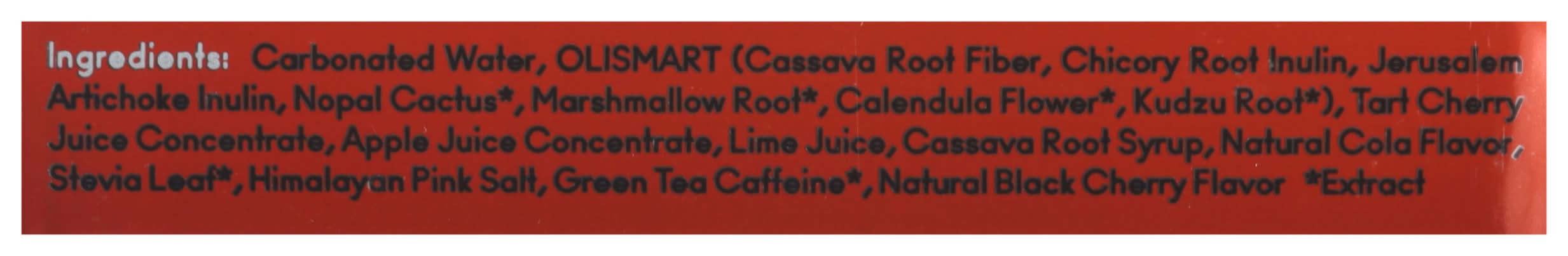 Ingredients: Carbonated Water, Olismart (Cassava Root Fiber, Chicory Root Inulin, Jerusalem Artichoke Inulin, Nopal Cactus, Marshmallow Root, Calendula Flower, Kudzu Root), Tart Cherry Juice Concentrate Apple Juice Concentrate Lime Juice Cassava Root Syrup Natural Cola Flavor Stevia Leaf Himalayan Pink Salt Green Tea Caffeine Natural Black Cherry Flavor. Extract