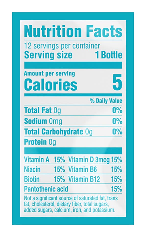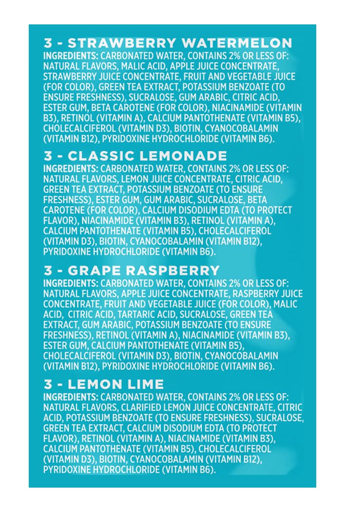 Ingredients: Strawberry Watermelon Ingredients: Carbonated Water, Contains 2% or Less of: Natural Flavors, Malic Acid, Apple Juice Concentrate, Strawberry Juice Concentrate, Fruit and Vegetable Juice for Color, Green Tea Extract, Potassium Benzoate to Ensure Freshness, Sucralose, Gum Arabic, Citric Acid, Ester Gum, Beta Carotene for Color, Niacinamide Vitamin B3, Retinol Vitamin A, Calcium Pantothenate Vitamin B5, Cholecalciferol Vitamin D3, Biotin, Cyanocobalamin Vitamin B12, Pyridoxine Hydrochloride Vitamin B6. Classic Lemonade Ingredients: Carbonated Water, Contains 2% or Less of: Natural Flavors, Lemon Juice Concentrate, Citric Acid, Green Tea Extract, Potassium Benzoate to Ensure Freshness, Ester Gum, Gum Arabic, Sucralose, Beta Carotene for Color, Calcium Disodium EDTA to Protect Flavor, Niacinamide Vitamin B3, Retinol Vitamin A, Calcium Pantothenate Vitamin B5, Cholecalciferol, Vitamin D3, Biotin, Cyanocobalamin Vitamin B12, Pyridoxine Hydrochloride Vitamin B6. Grape Raspberry Ingredients: Carbonated Water, Contains 2% or Less of: Natural Flavors, Apple Juice Concentrate, Raspberry Juice Concentrate, Fruit and Vegetable Juice for Color, Malic Acid, Citric Acid, Tartaric Acid, Sucralose, Green Tea Extract, Gum Arabic, Potassium Benzoate to Ensure Freshness, Retinol Vitamin A, Niacinamide Vitamin B3, Ester Gum, Calcium Pantothenate Vitamin B5, Cholecalciferol Vitamin D3, Biotin, Cyanocobalamin Vitamin B12, Pyridoxine Hydrochloride Vitamin B6. Lemon Lime Ingredients: Carbonated Water, Contains 2% or Less of: Natural Flavors, Clarified Lemon Juice Concentrate, Citric Acid, Potassium Benzoate to Ensure Freshness, Sucralose, Green Tea Extract, Calcium Disodium EDTA to Protect Flavor, Retinol Vitamin A, Niacinamide Vitamin B3, Calcium Pantothenate Vitamin B5, Cholecalciferol Vitamin D3, Biotin, Cyanocobalamin Vitamin B112, Pyridoxine Hydrochloride Vitamin B6.