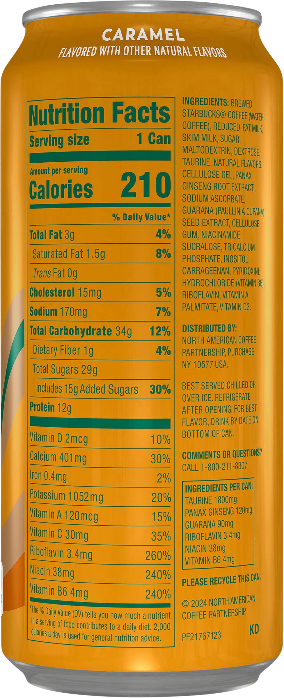 Ingredients: Brewed Starbucks Coffee (Water, Coffee), Reduced-Fat Milk, Skim Milk, Sugar, Maltodextrin, Dextrose, Taurine, Natural Flavors, Cellulose Gel, Panax Ginseng Root Extract, Sodium Ascorbate, Guarana (Paullinia Cupana) Seed Extract, Cellulose Gum, Niacinamide, Sucralose, Tricalcium Phosphate, Inositol, Carrageenan, Pyridoxine Hydrochloride (Vitamin B6), Riboflavin, Vitamin a Palmitate, Vitamin D3 Contains: Milk