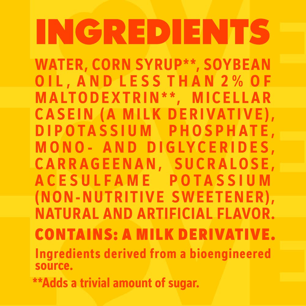 Ingredients: WATER, CORN SYRUP**, SOYBEAN OIL, AND LESS THAN 2% OF MALTODEXTRIN**, MICELLAR CASEIN (A MILK DERIVATIVE), DIPOTASSIUM PHOSPHATE, MONO- AND DIGLYCERIDES, CARRAGEENAN, SUCRALOSE, ACESULFAME POTASSIUM (NON-NUTRITIVE SWEETENER), NATURAL AND ARTIFICIAL FLAVOR. **Adds a trivial amount of sugar Contains: CONTAINS: A MILK DERIVATIVE.