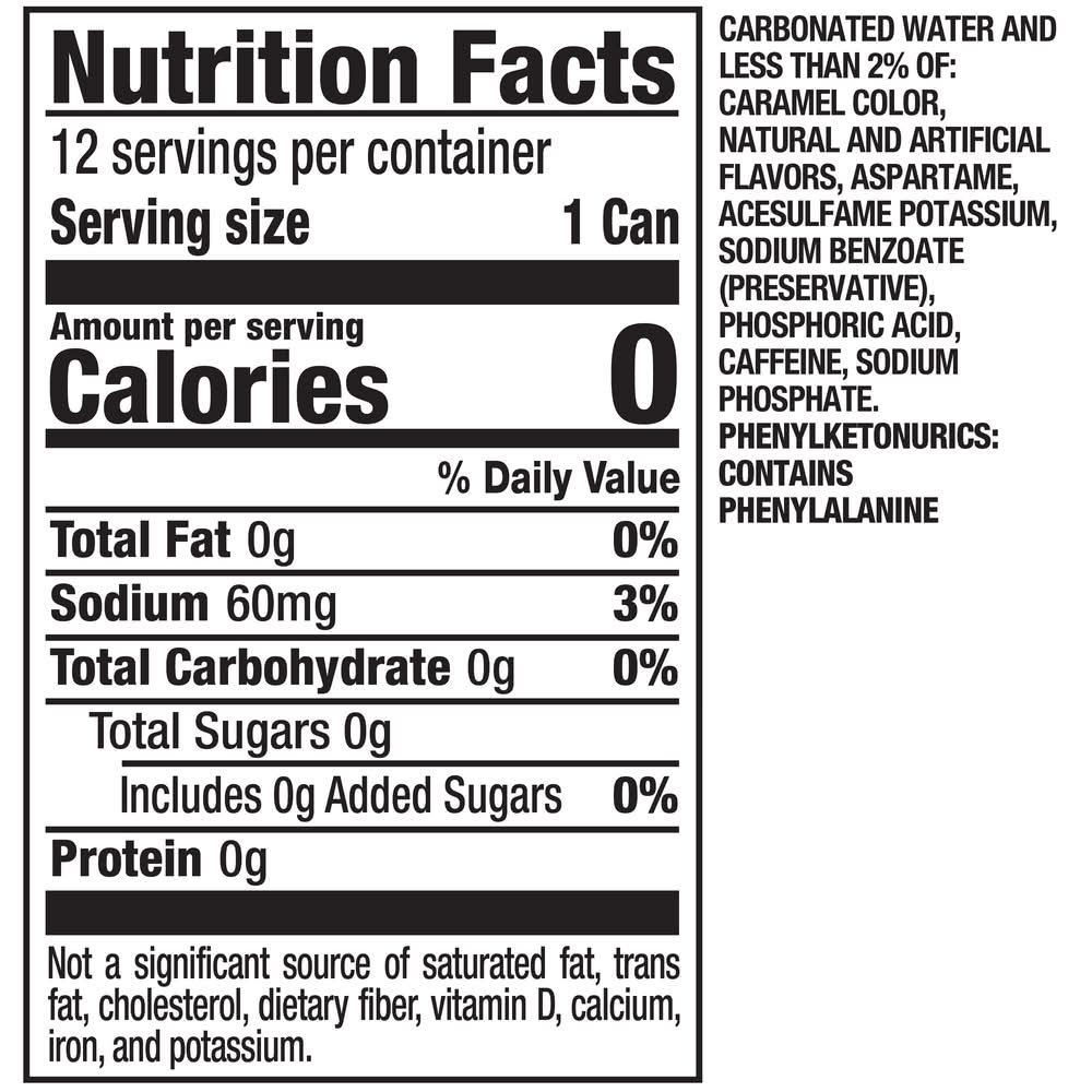 Ingredients: Carbonated Water, and Less than 2% of: Caramel Color, Natural and Artificial Flavors, Aspartame, Acesulfame Potassium, Sodium Benzoate (Preservative), Phosphoric Acid, Caffeine, Sodium Phosphate. Additives: Artificial Flavors