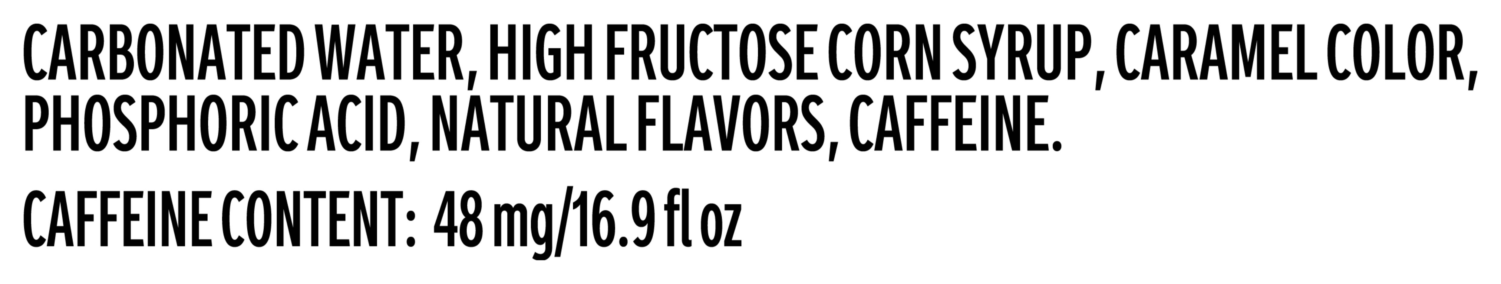 Ingredients: Carbonated Water, High Fructose Corn Syrup, Caramel Color, Phosphoric Acid, Natural Flavors, Caffeine. Contains: Corn (Maize)