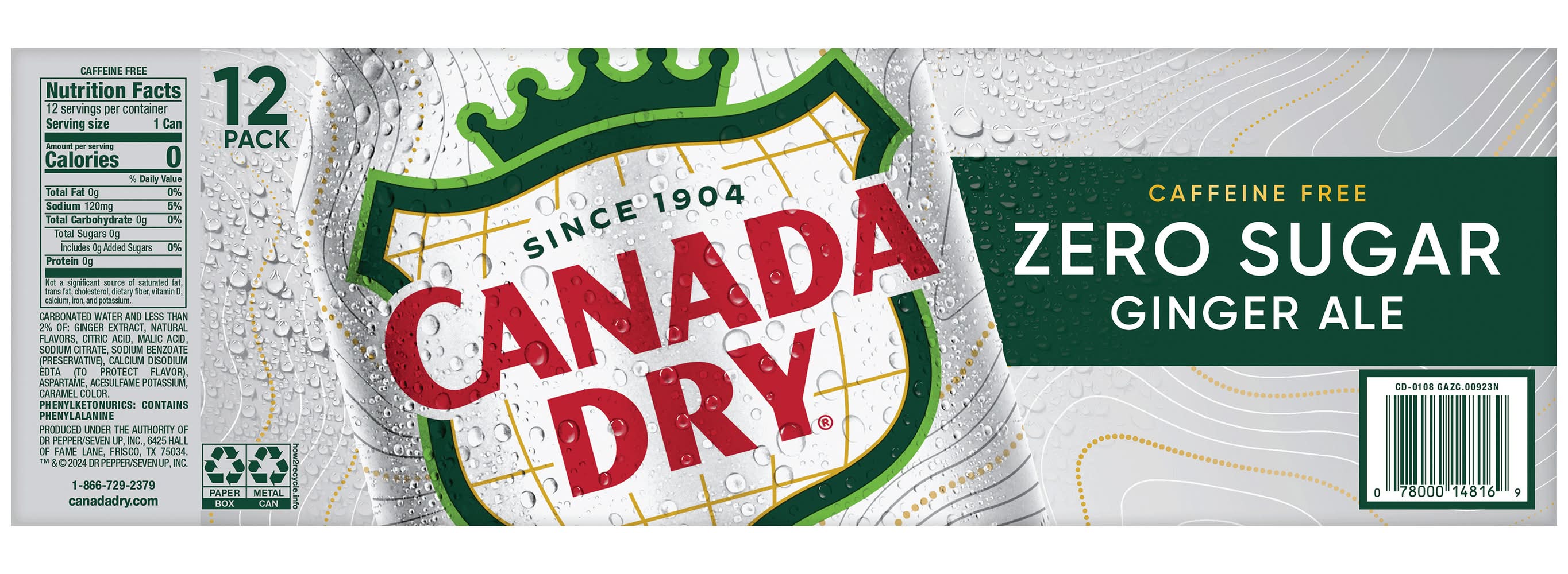Sip into your comfort zone with the crisp goodness of Canada Dry Zero Sugar Ginger Ale. There comes a time when we all need a break from the treadmill of life, and there’s only one thing to do during those moments when we need an escape from stresses and obligations. Grab an ice-cold can of Canada Dry Ginger Ale, and sip into your comfort zone. Whether that means you’re sitting on your front porch swing, listening to your favorite podcast or just taking a quiet moment for yourself, Canada Dry Ginger Ale Zero Sugar is the perfect ginger ale to make it even better. And it's caffeine free! Once transported to the comfort zone, you can enjoy the refreshing ginger taste made with only high quality ingredients, soothing you with each comforting sip. For over 100 years, Canada Dry has been creating quality carbonated beverages and mixers that can be enjoyed at any time of day. Never skimping on quality, Canada Dry Ginger Ale Zero Sugar offers a refreshing ginger taste that's caffeine free and contains zero calories. Enhance your favorite cocktails with a sparkling splash of Canada Dry Zero Sugar or enjoy by itself for crisp, clean refreshment. So grab an ice-cold can of Canada Dry Zero Sugar, sink into your favorite chair, and sip into the comfort zone. • Pack size: 12 • Dr Pepper/Seven Up, Inc., 5301 Legacy Drive,Plano,TX,75024 • Packaging: Reusable