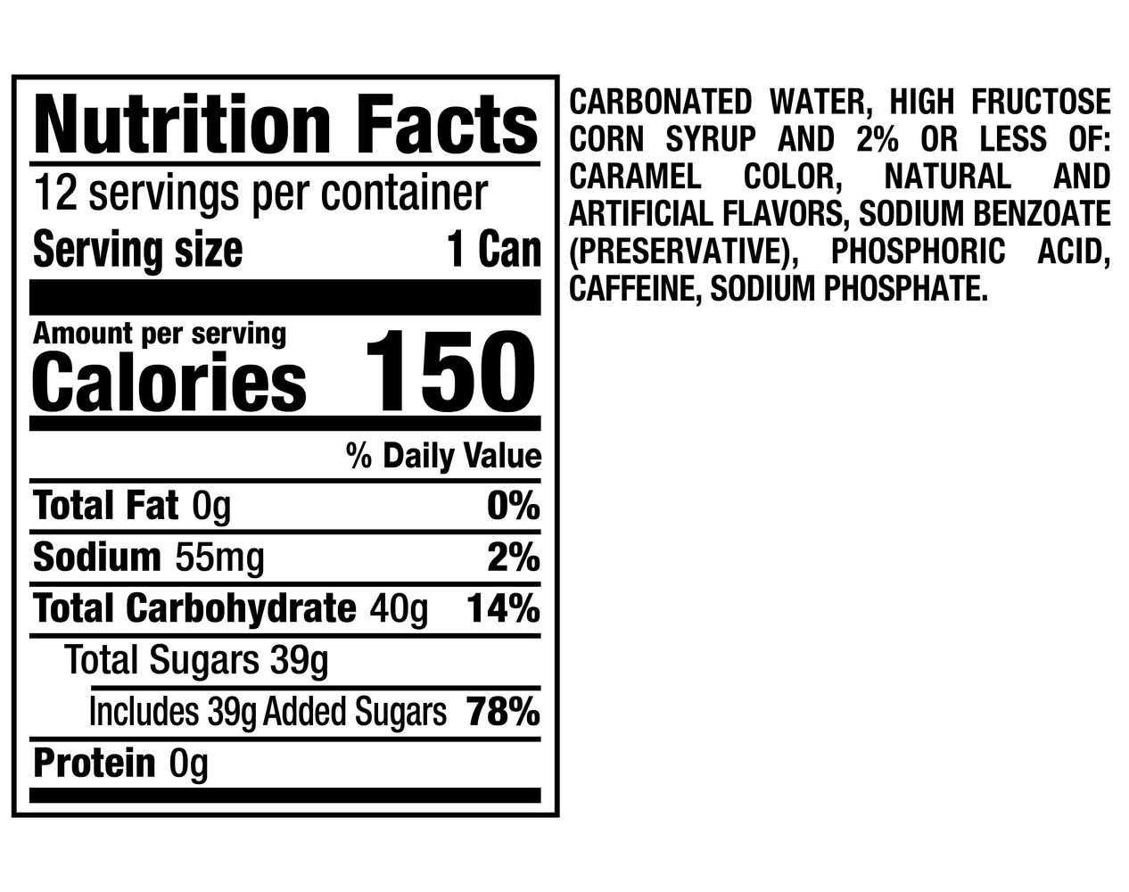 Ingredients: Carbonated Water, High Fructose Corn Syrup and 2% or Less of: Caramel Color, Natural and Artificial Flavors, Sodium Benzoate (Preservative), Phosphoric Acid, Caffeine, Sodium Phosphate.