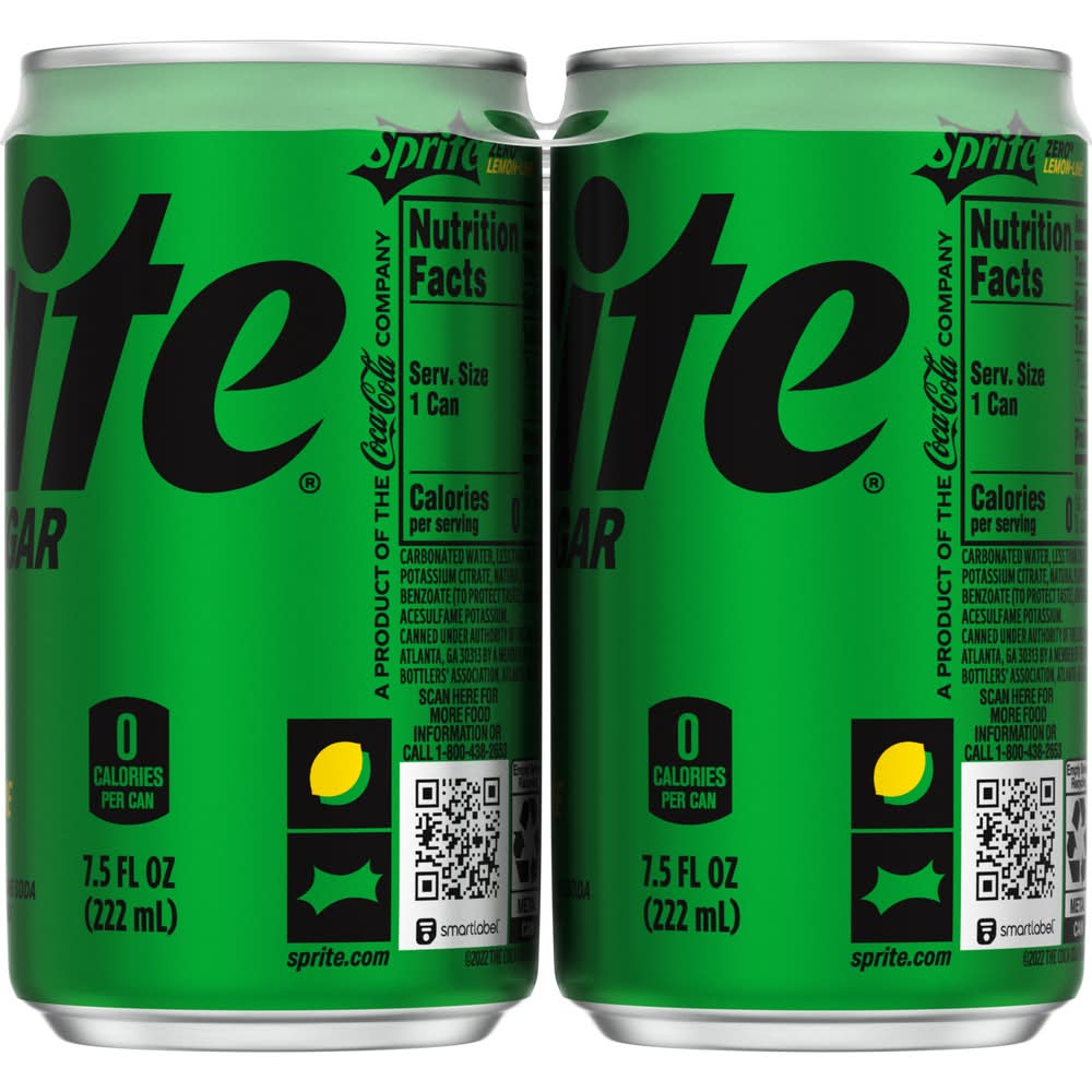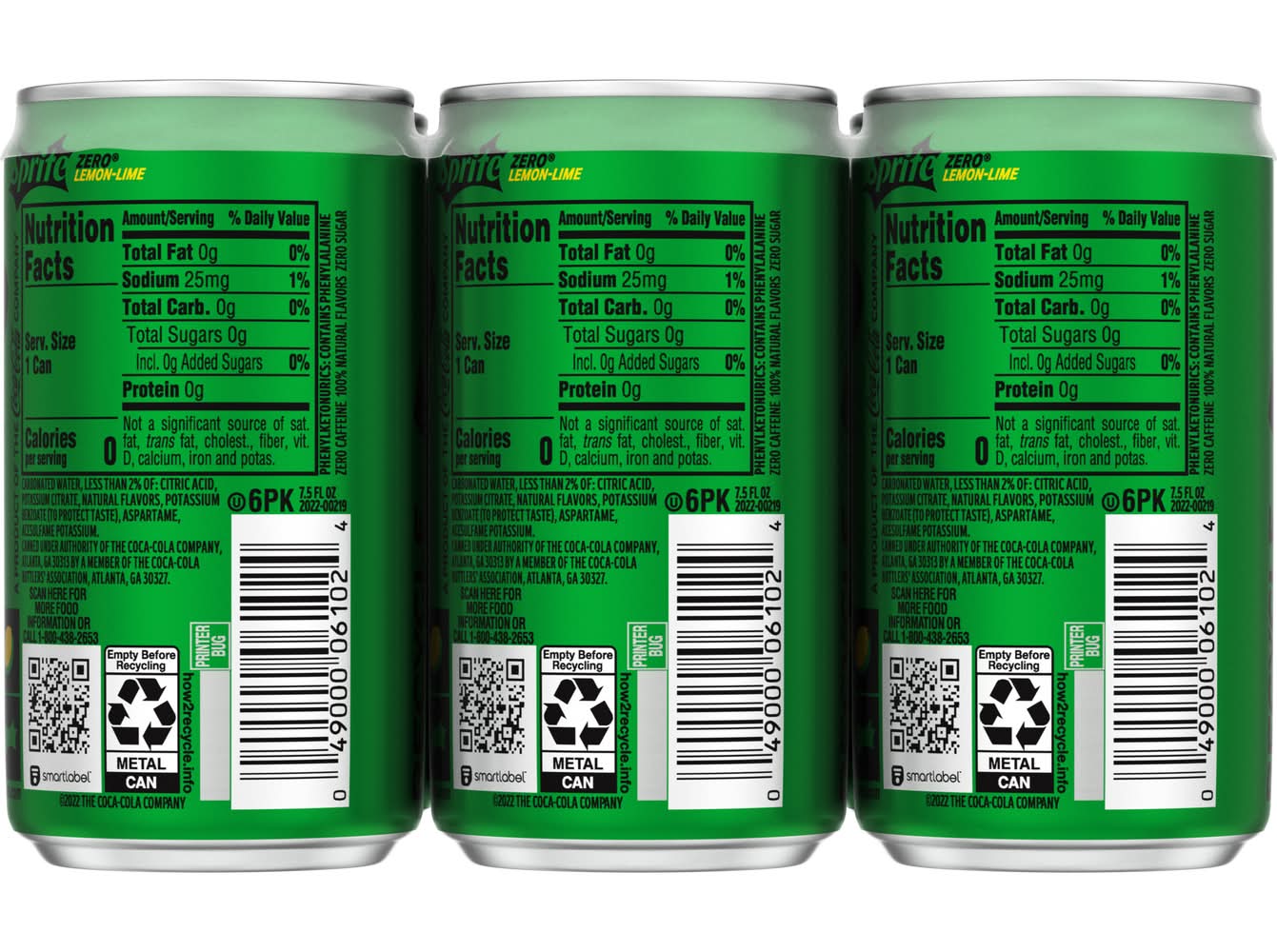 You've got a thirst. And it can't be quenched by just any zero-sugar citrus soda. You need a taste that stands apart, that cuts through the noise so you can make your mark on culture. Sprite Zero Sugar's cool and crisp lemon-lime flavor will keep you invigorated and inspired. You know why? Because Sprite Zero Sugar keeps it real just like you when pursuing your passions. No caffeine. Zero sugar. Just you, an iconic flavor, and whatever you can think of next. So, pick up a 7.5oz mini can 6 packof caffeine-free Sprite Zero Sugar soda today and make your mark. • Flavor: Lemon-lime • Pack size: 6 • The coca-cola company, Atlanta, GA, 30313, 800-438-2653 • Packaging: Reusable
