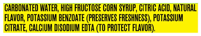 Ingredients: Carbonated Water, High Fructose Corn Syrup, Citric Acid, Natural Flavor, Potassium Benzoate (Preserves Freshness), Potassium Citrate, Calcium Disodium EDTA (to Protect Flavor) Contains: Corn