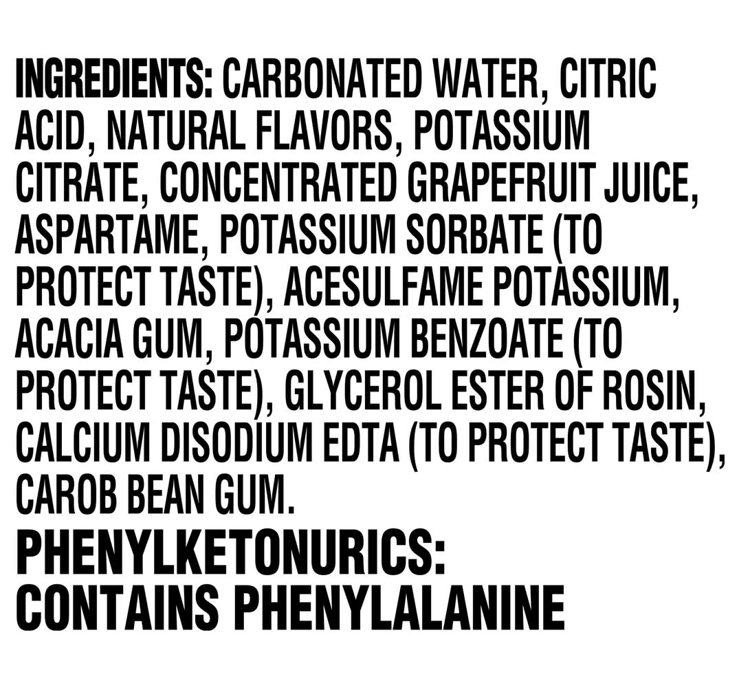 Ingredients: Carbonated Water, Citric Acid, Natural Flavors, Potassium Citrate, Concentrated Grapefruit Juice, Aspartame, Potassium Sorbate (To Protect Taste), Acesulfame Potassium, Acacia Gum, Potassium Benzoate (To Protect Taste), Glycerol Ester Of Rosin, Calcium Disodium Edta (To Protect Taste), Carob Bean Gum. Contains: Phenylalanine