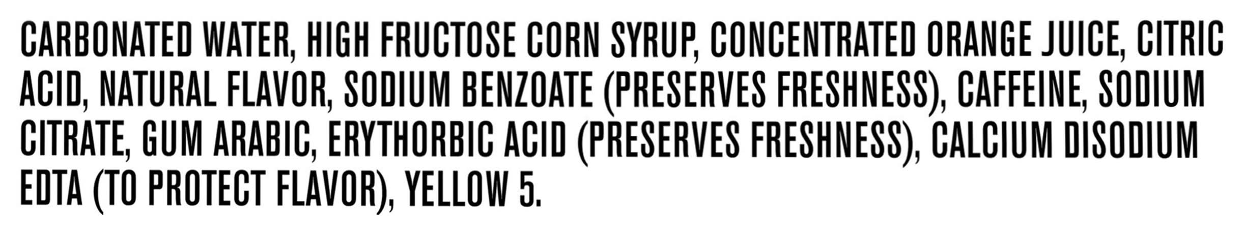 Ingredients: Carbonated Water, High Fructose Corn Syrup, Concentrated Orange Juice, Citric Acid, Natural Flavor, Sodium Benzoate (Preserves Freshness), Caffeine, Sodium Citrate, Gum Arabic, Erythorbic Acid (Preserves Freshness), Calcium Disodium EDTA (to Protect Flavor), Yellow 5