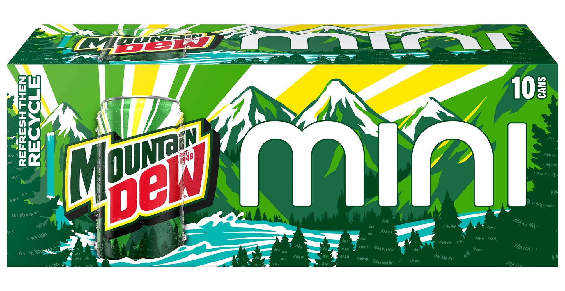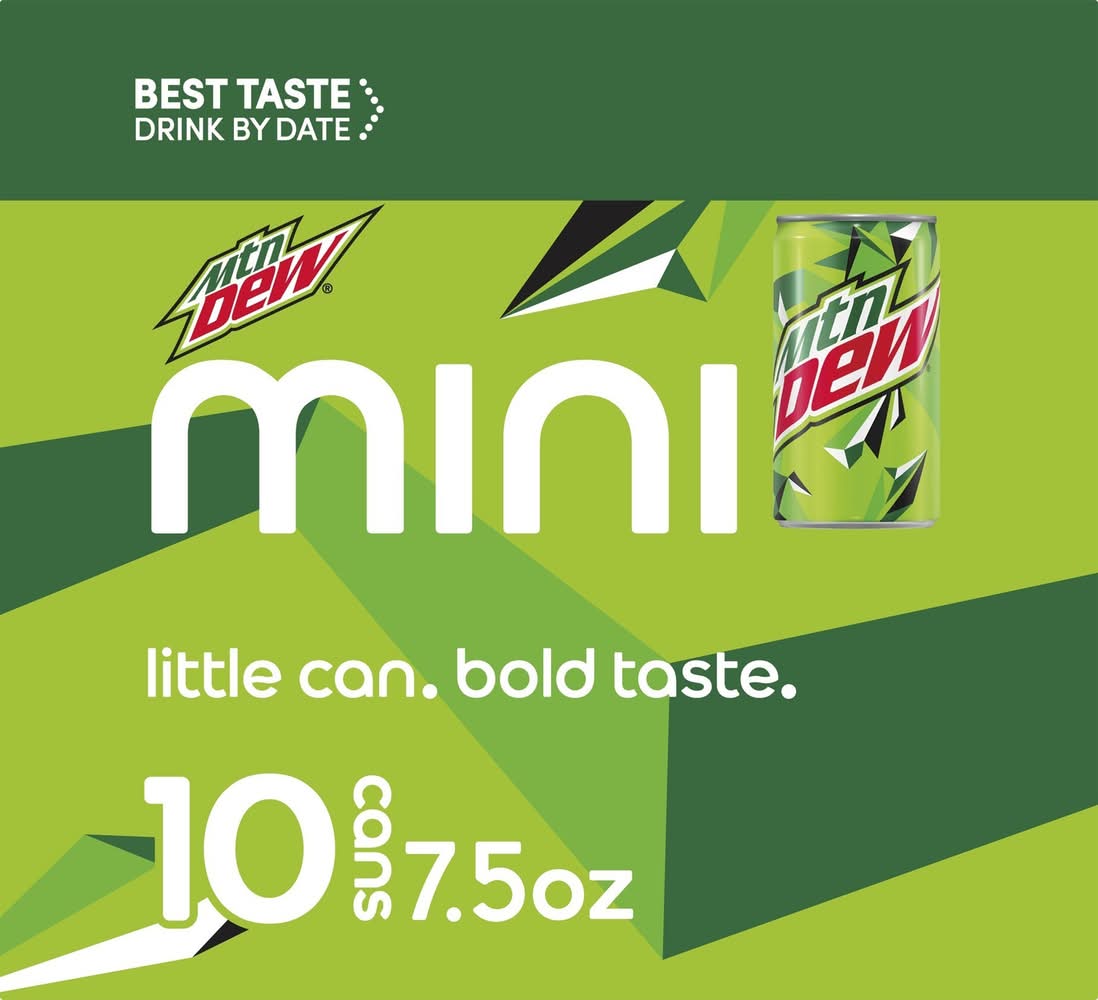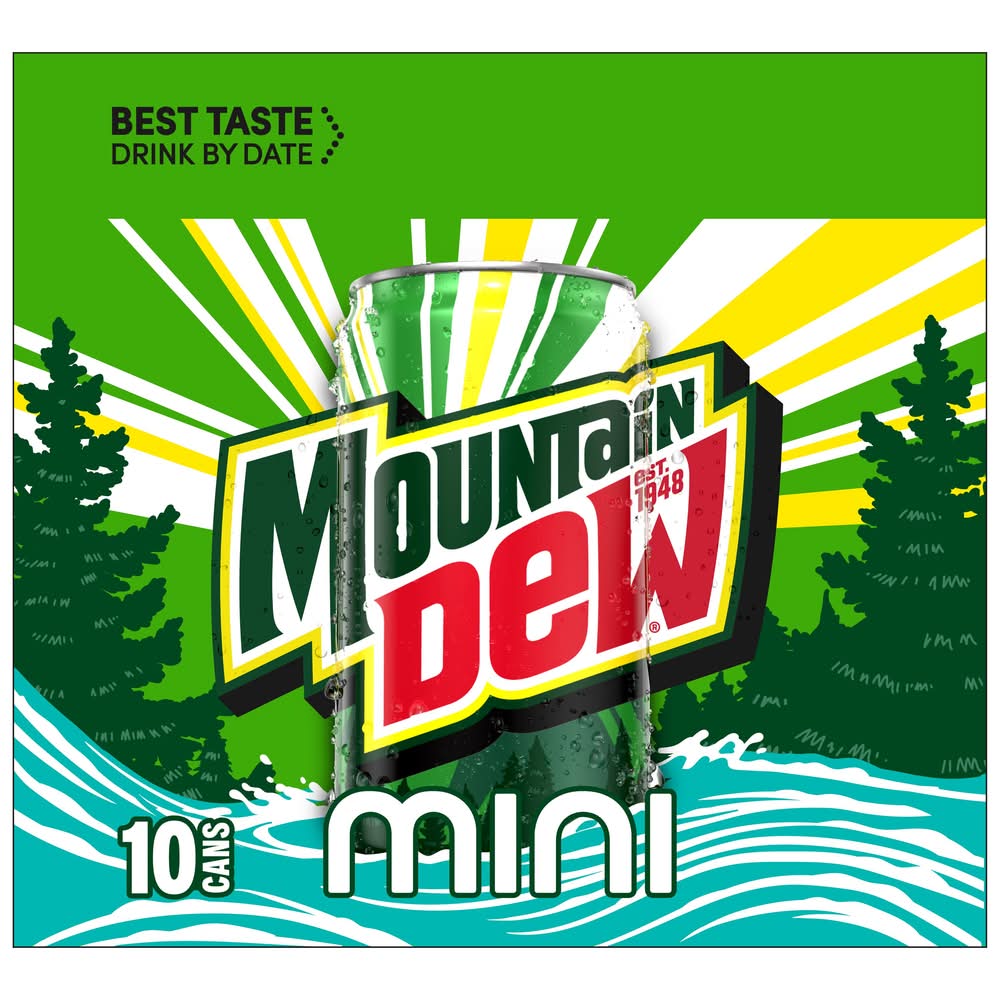 Mtn Dew Mini Soda is offered in a package containing 10 cans, each with a volume of 7.5 fluid ounces. Each can contains 110 calories, no saturated fat, 40 milligrams of sodium, representing 2% of the daily value, and 29 grams of total sugars. The caffeine content per can is 34 milligrams. The product is packaged in a small can designed to deliver a bold taste. • Pack size: 10 • Packaging: Reusable