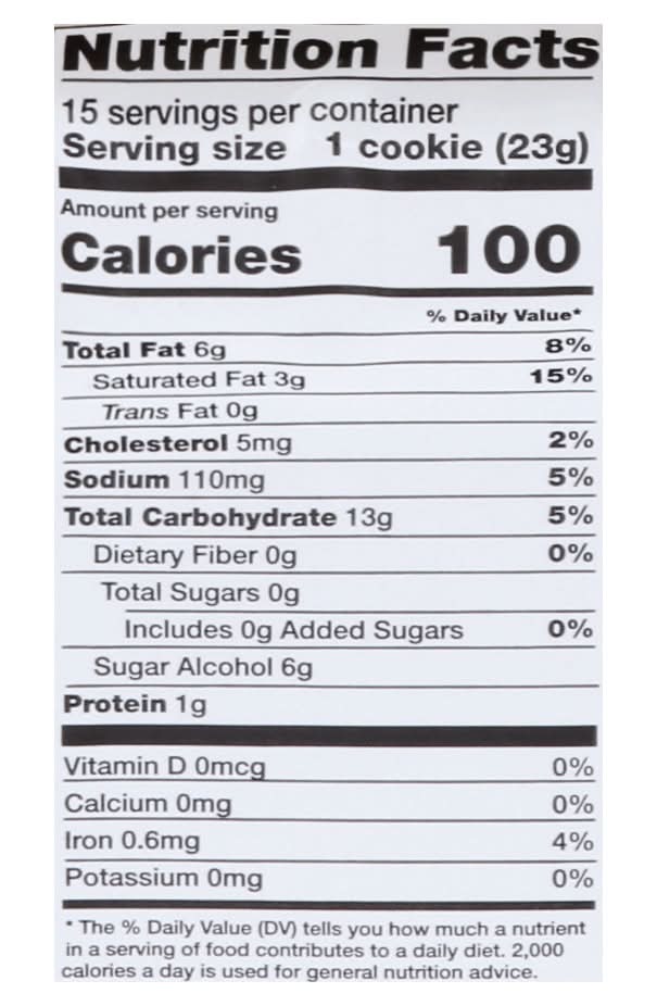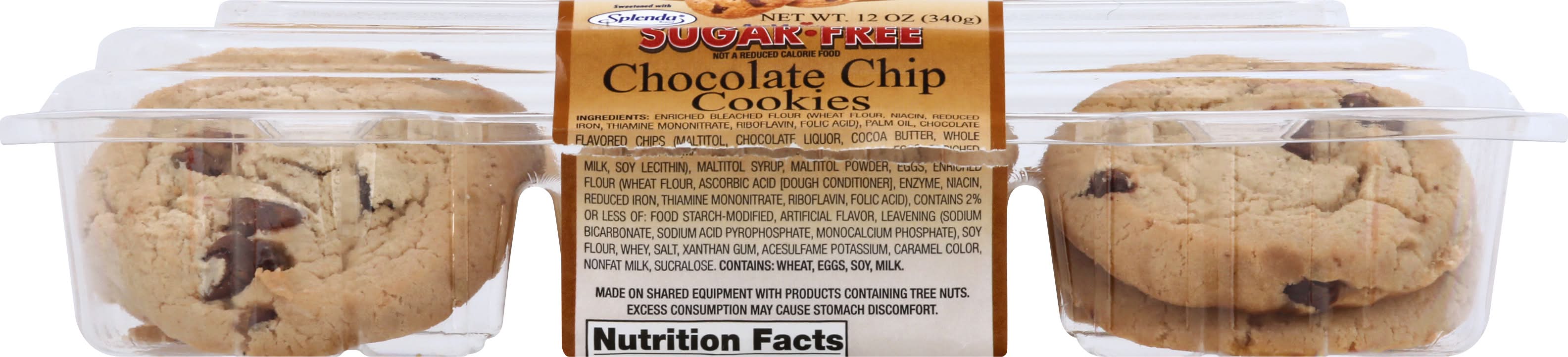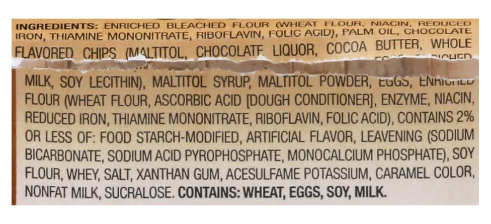 Ingredients: Enriched Bleached Flour (Wheat Flour, Niacin, Reduced Iron, Thiamine Mononitrate, Riboflavin, Folic Acid), Palm Oil, Chocolate Flavored Chips, (Maltitol, Chocolate Liquor, Cocoa Butter, Whole Milk, Soy Lecithin), Maltitol Syrup, Maltitol Powder, Eggs Enriched Flour (Wheat Flour, Ascorbic Acid [Dough Conditioner], Enzyme, Niacin, Reduced Iron, Thiamine Mononitrate, Riboflavin, Folic Acid), Contains 2% or Less of: Food Starch-Modified, Artificial Flavor, Leavening (Sodium Bicarbonate, Sodium Acid Pyrophosphate, Monocalcium Phosphate), Soy Flour, Whey, Salt, Xanthan Gum, Acesulfame Potassium, Caramel Color, Nonfat Milk, Sucralose Contains: Wheat, Eggs, Soybeans, Milk, Tree Nuts