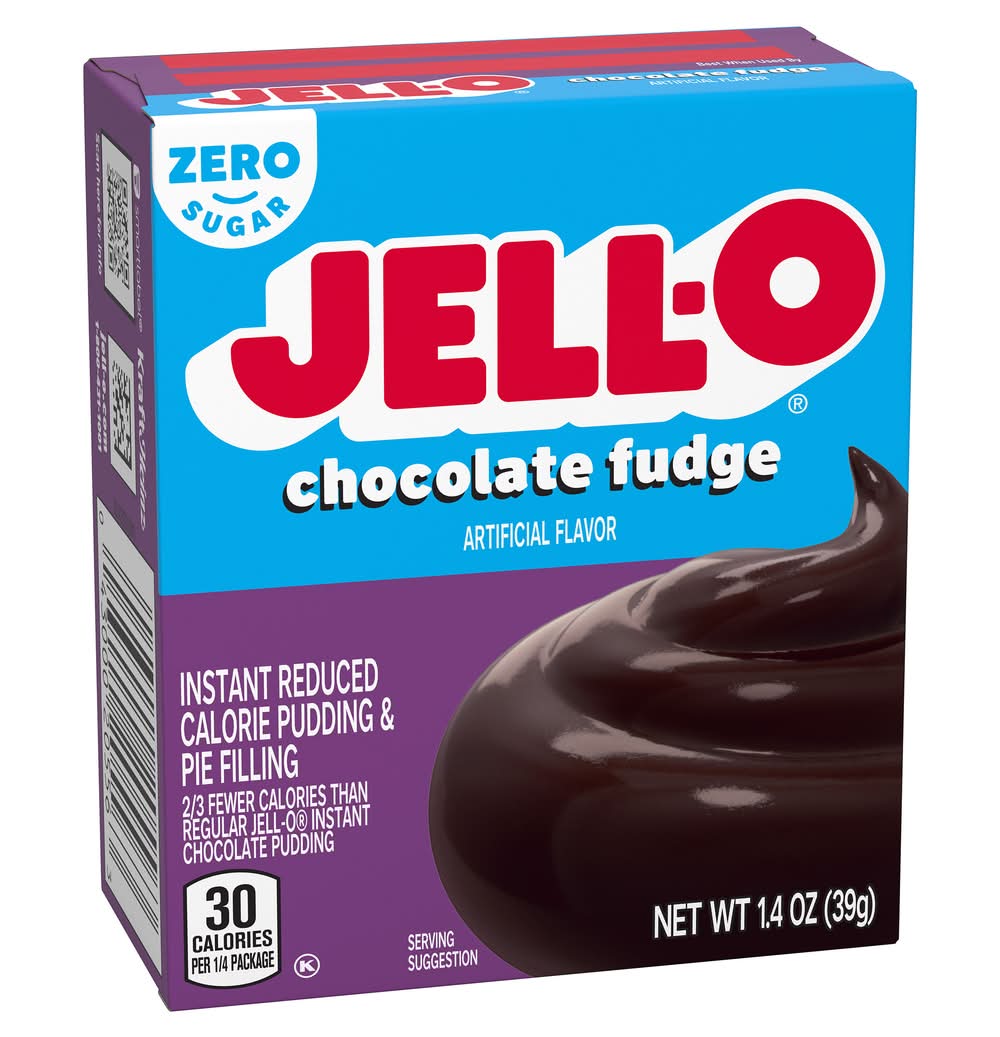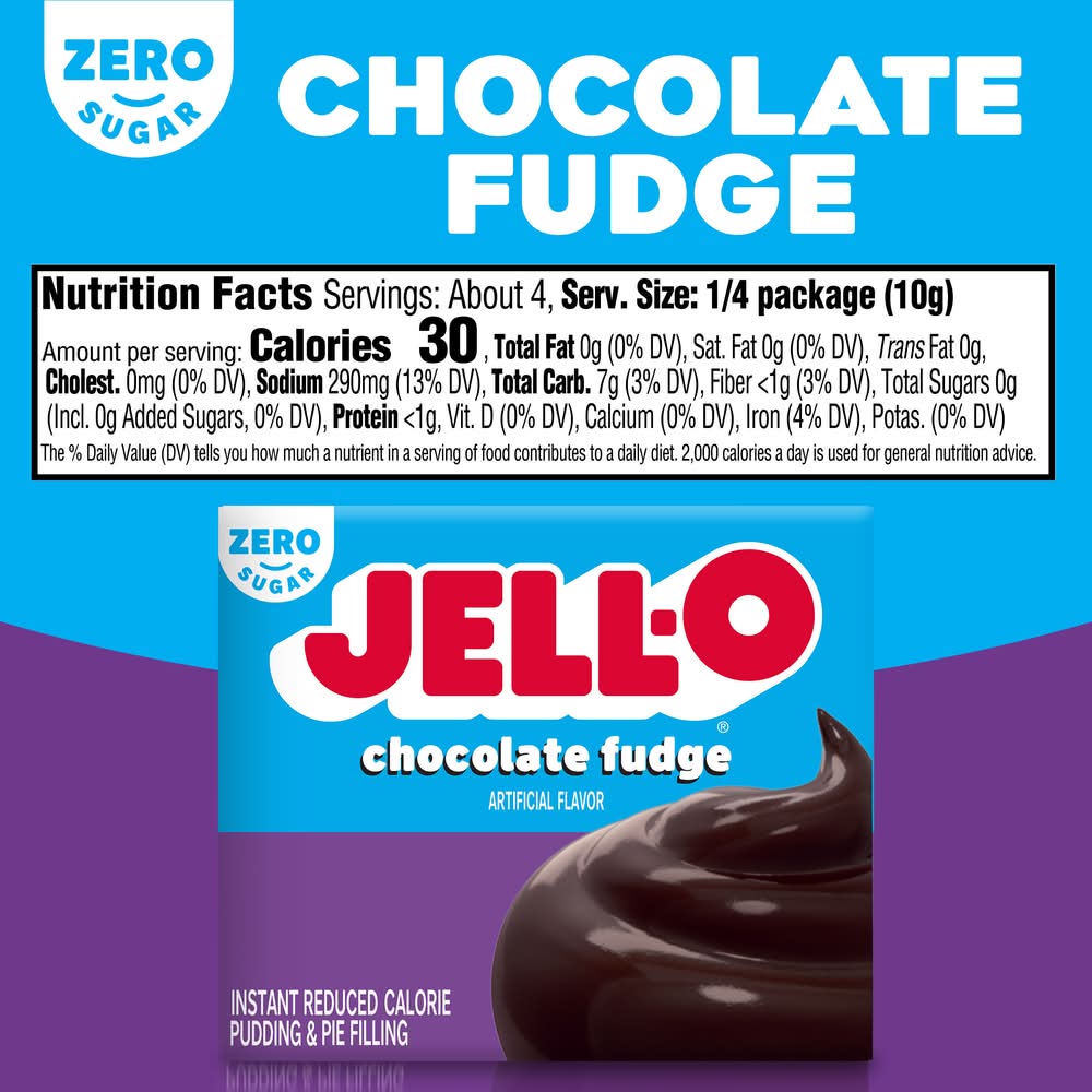 Snack happy. Jell-O Zero Sugar Chocolate Fudge Artificially Flavored Instant Reduced Calorie Pudding Mix & Pie Filling tastes delicious whether you enjoy it as a treat or use it as an ingredient in your favorite dessert recipes. Add some wonder to your day with a delicious snack. Fun to make with your kids, our zero sugar artificially flavored chocolate fudge pudding mix can also be used to create a poke cake, tasty crepes or chocolate fudge pie filling. You'll feel good about serving our zero sugar pudding mix that is 2/3 fewer calories than regular Jell-O instant chocolate pudding; as packaged, this product contains 30 calories, regular product contains 100 calories. Our zero sugar artificially flavored chocolate fudge pudding is ready in as little as five minutes. Simply stir milk into the pudding mix and allow to set. Every zero sugar Jell-O pudding mix comes packaged in a 1.4-ounce sealed pouch. Pudding fun in every bite. Kraft Heinz Foods Company, Chicago,IL,60601