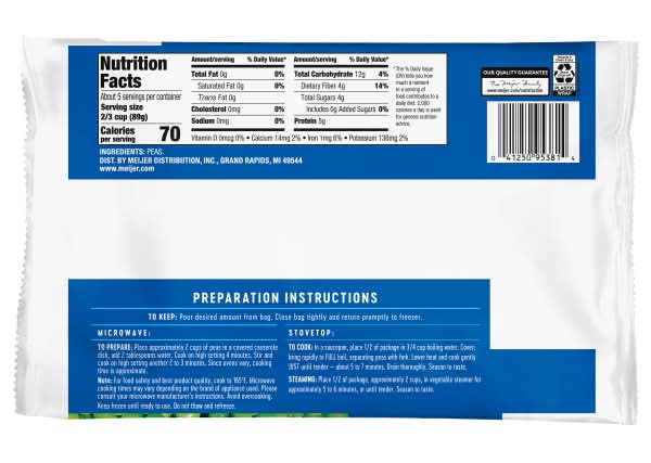 Meijer Frozen Green Peas are a versatile addition to your meals. With about five servings per container, these peas are a convenient choice for enhancing your dishes with a touch of green and a burst of fresh flavor.