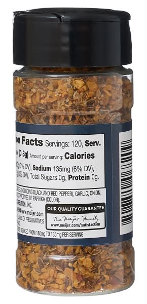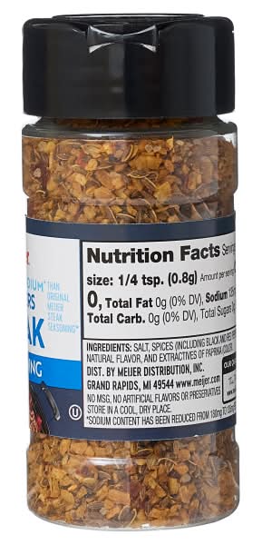 Meijer Grillers 25% Less Sodium Steak Seasoning provides a flavorful blend of black pepper, red peppers, garlic, and onion. It is specifically formulated to enhance the taste of steak, regardless of whether it is cooked medium rare or well done. Packaged in a 3.4 oz container, this seasoning is tailored for those looking to reduce sodium intake without compromising on taste.