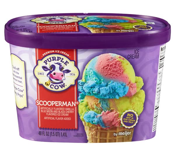 It?s a bird! It?s a plane! Actually, it?s just delicious Purple Cow ScooperMan Ice Cream. An irresistible mix of vanilla, blue moon and black cherry flavored ice cream, this tasty ice cream is so good you?ll feel like a dream came true with every bite. Flavor: Vanilla blue moon and black berry