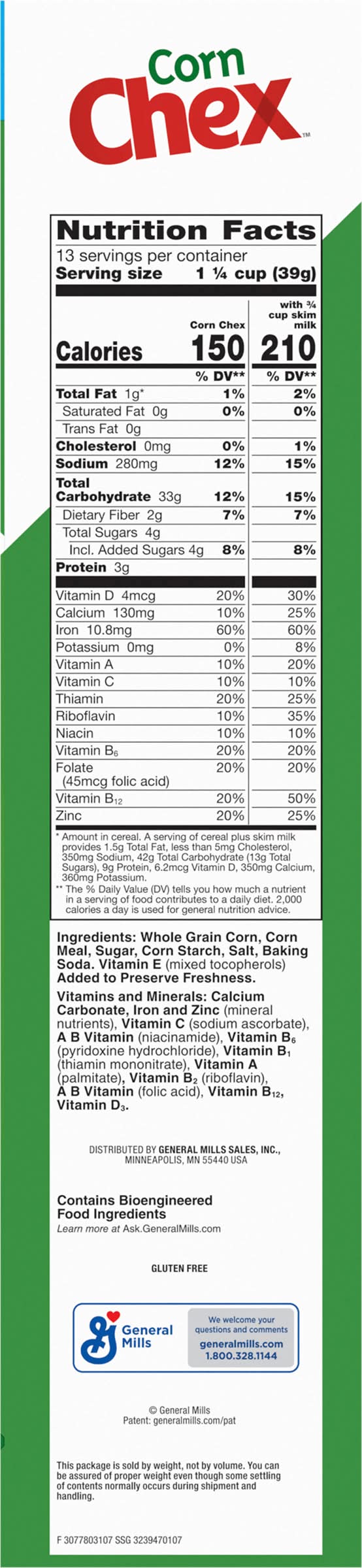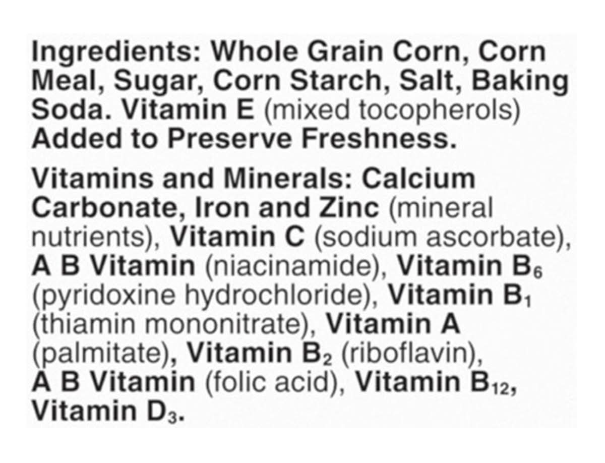 Ingredients: Whole Grain Corn, Corn Meal, Sugar, Corn Starch, Salt, Baking Soda, Vitamin E (Mixed Tocopherols) Added to Preserve Freshness, Vitamins and Minerals: Calcium Carbonate, Iron and Zinc (Mineral Nutrients), Vitamin C (Sodium Ascorbate), a B Vitamin (Niacinamide), Vitamin B6 (Pyridoxine Hydrochloride), Vitamin B1 (Thiamin Mononitrate), Vitamin A (Palmitate), Vitamin B2 (Riboflavin), a B Vitamin (Folic Acid), Vitamin B12, Vitamin D3 Contains: Corn