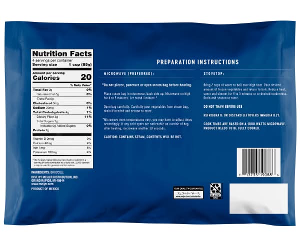 Meijer Steamable Broccoli Florets is a vegetable conveniently packaged to be steamed directly in its bag. It is versatile enough to be served as a side dish or integrated into pasta, soup, or salad preparations. The steamable packaging simplifies the cooking process, making it an ideal choice for quick and easy meal preparations.