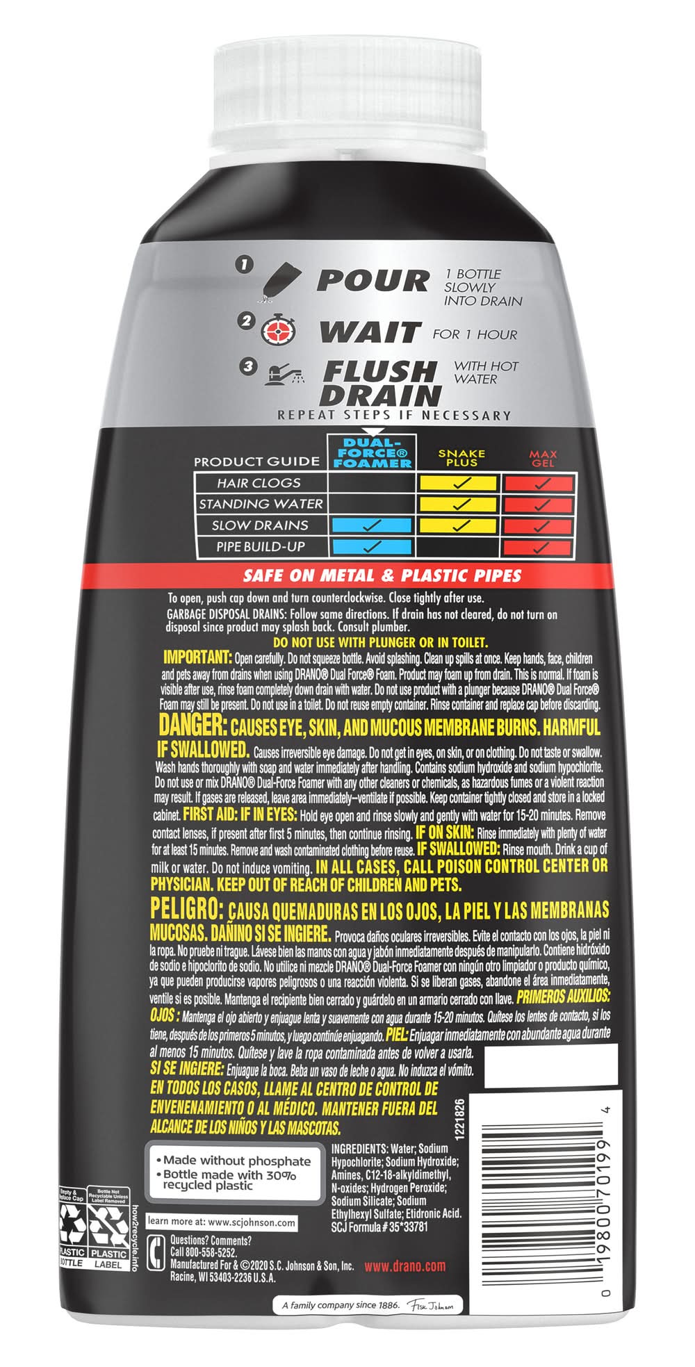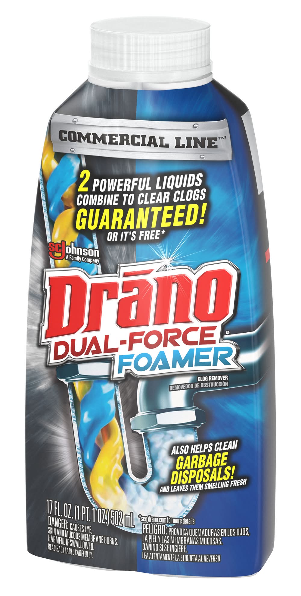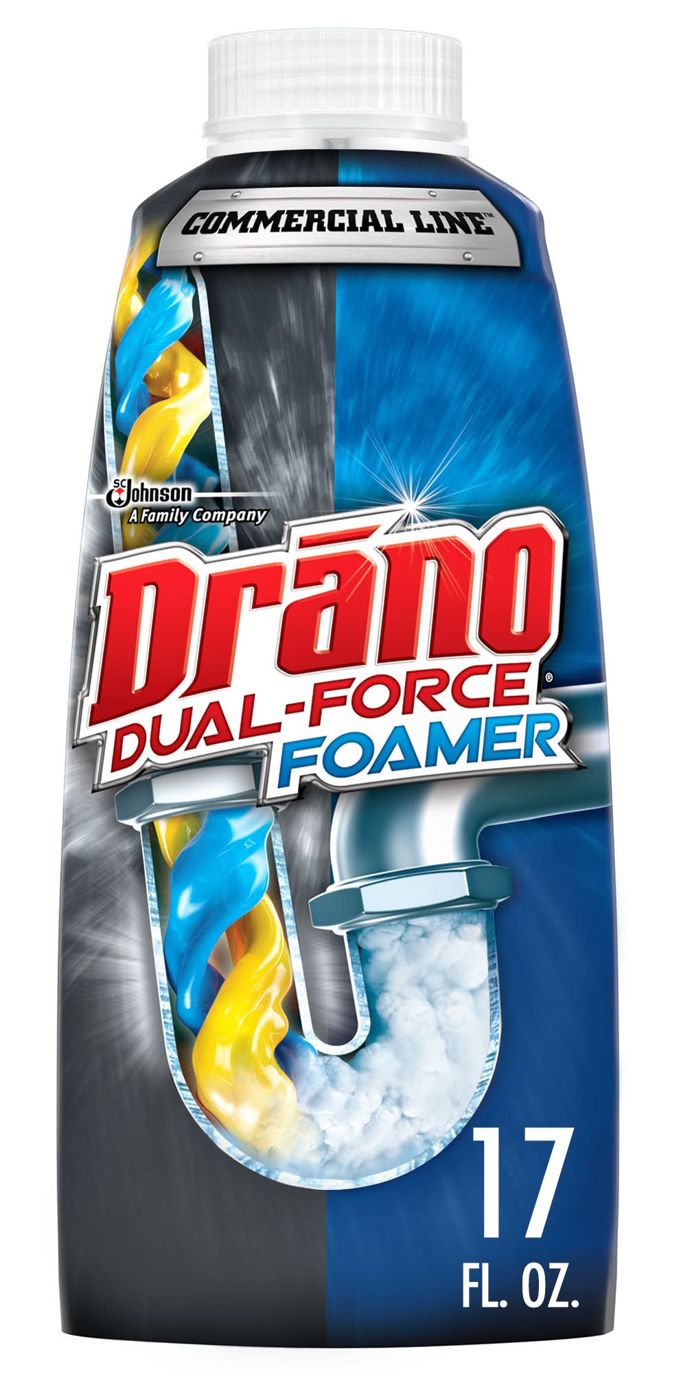 Drano Dual-Force Foamer Clog Remover is a 17 fluid ounce solution designed to effectively clear blockages in drains. Its dual-force foam works to remove clogs with a formula that acts on contact, providing a reliable solution for maintaining unobstructed pipes. S C JOHNSON & SON, Racine, WI, 53403-2236, Ph: 800-558-5252