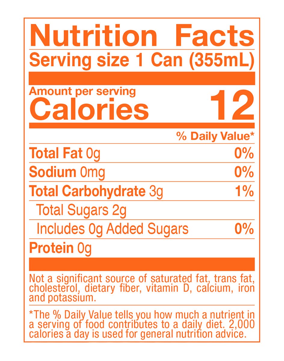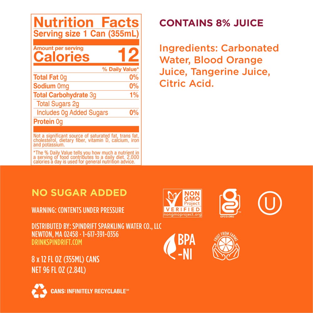 Ingredients: Carbonated Water, Blood Orange Juice, Tangerine Juice, Citric Acid (to Maintain Freshness)
