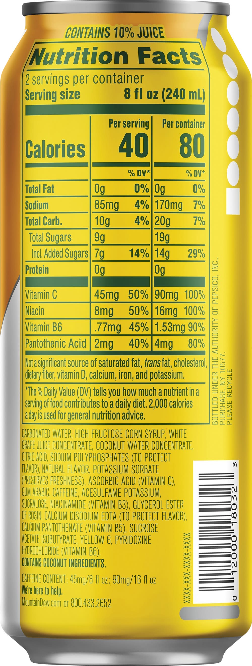 Ingredients: Carbonated Water, High Fructose Corn Syrup, White Grape Juice Concentrate, Coconut Water Concentrate, Citric Acid, Sodium Polyphosphates (to Protect Flavor), Natural Flavor, Potassium Sorbate (Preserves Freshness), Ascorbic Acid (Vitamin C), Gum Arabic, Caffeine, Acesulfame Potassium, Sucralose, Niacinamide, Glycerol Ester of Rosin, Calcium Disodium EDTA (to Protect Flavor), Calcium Pantothenate, Sucrose Acetate Isobutyrate, Yellow 6, Pyridoxine Hydrochloride (Vitamin B6) Contains: Tree Nuts Contains 45mg of caffeine
