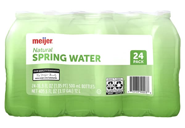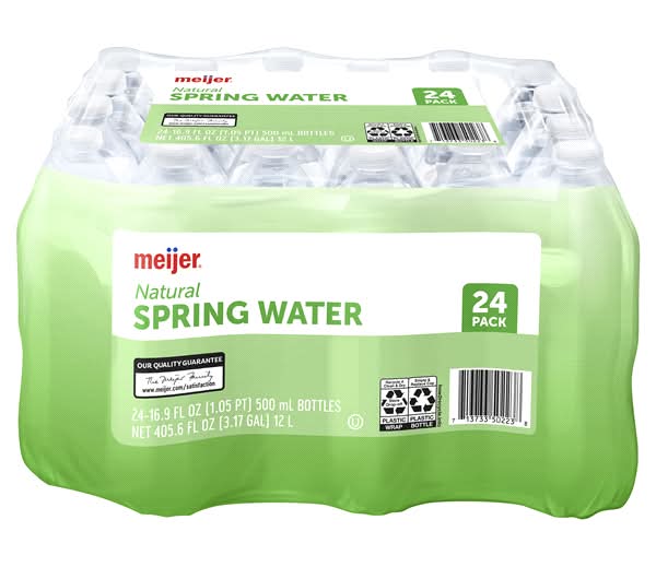 Meijer Natural Spring Water comes in a pack with each bottle containing natural spring water described as crisp and refreshing. The packaging is designed for convenience and portability, making it suitable for hydration during sports, travel, and family needs. • Pack size: 24 • Packaging: Reusable