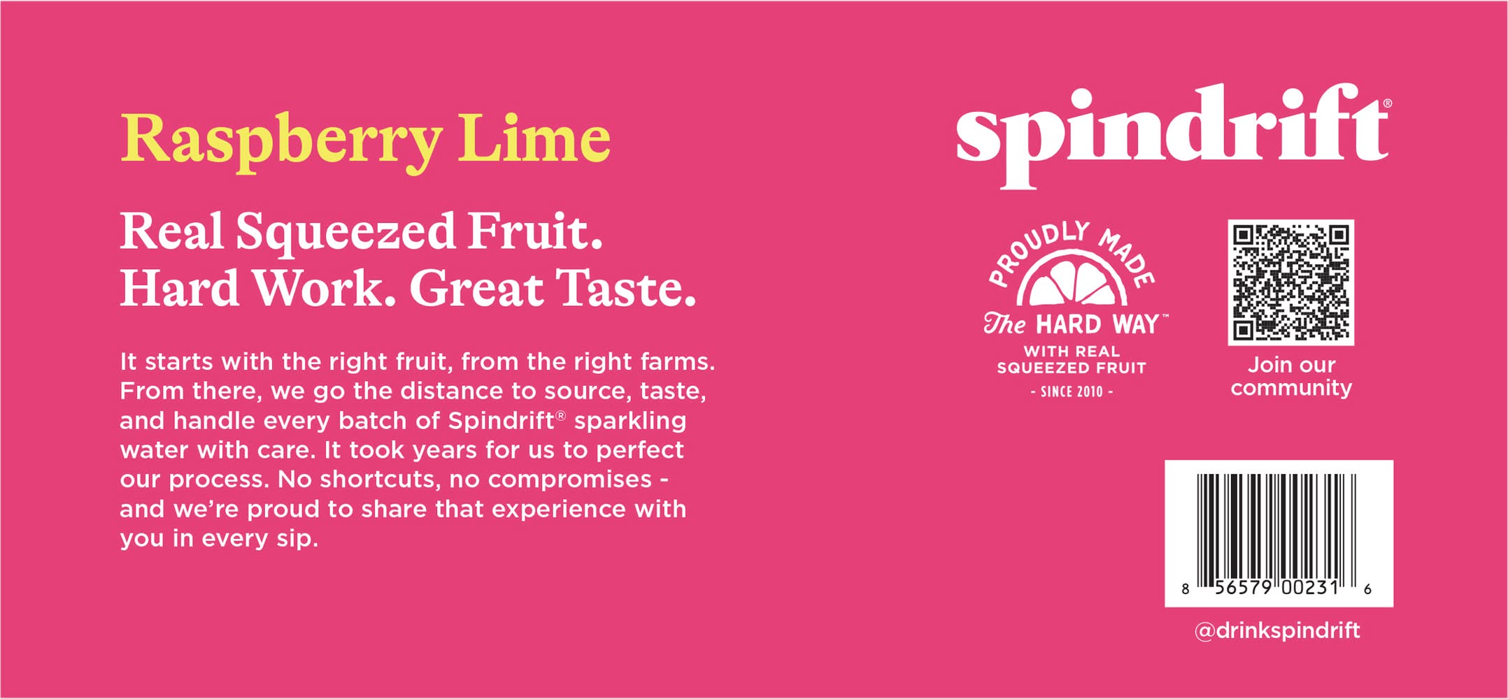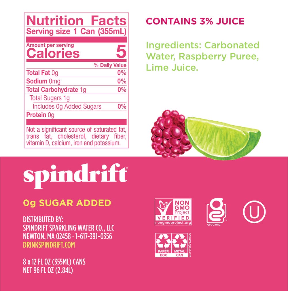 Spindrift Raspberry Lime Sparkling Water is lightly carbonated, slightly pulpy, and is made with real raspberries and limes from family farms. Our Raspberries are sourced from the Pacific Northwest, and limes are sourced from a 3rd generation citrus farm in California, ensuring the highest quality and taste. One can contains 4% fruit juice, and is only 9 calories. • Flavor: Raspberry lime • Pack size: 8 • Packaging: Reusable