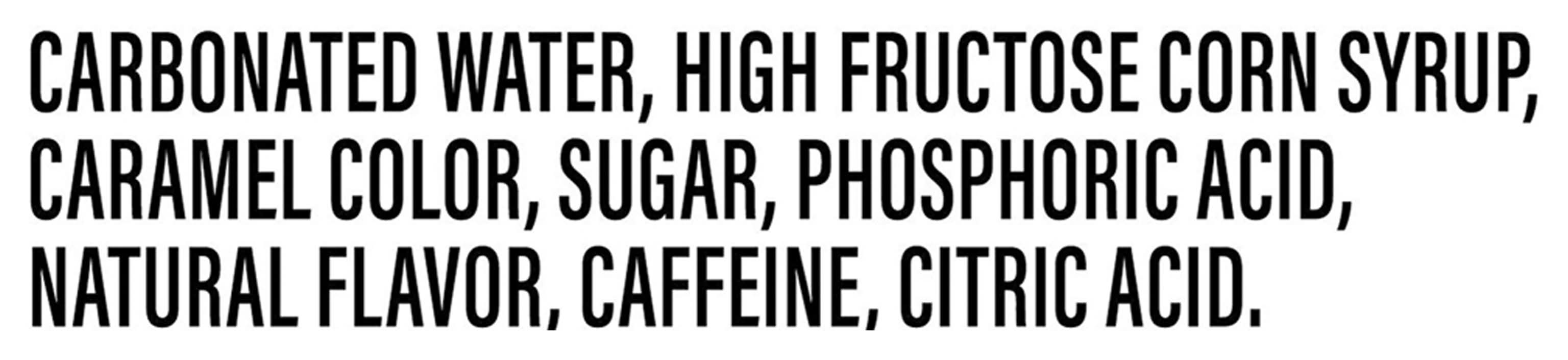 Ingredients: Carbonated Water, High Fructose Corn Syrup, Caramel Color, Sugar, Phosphoric Acid, Natural Flavor, Caffeine, Citric Acid Contains: Corn (Maize)