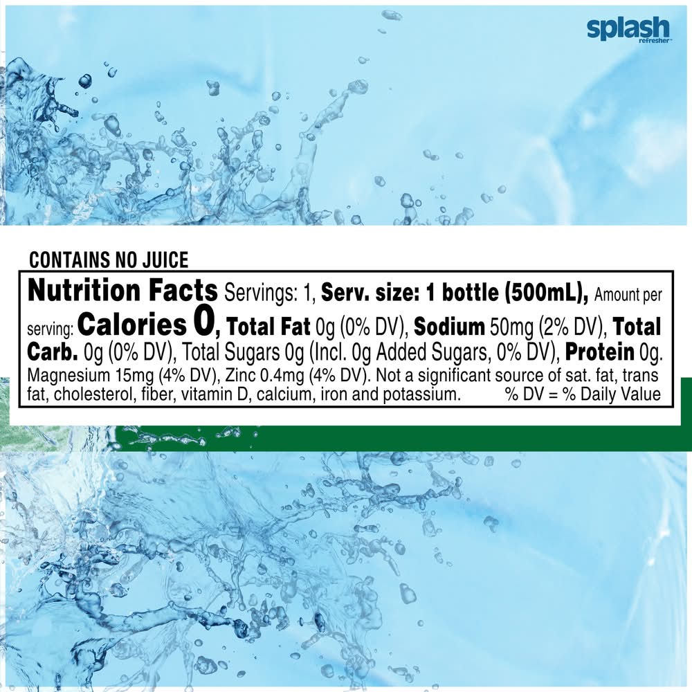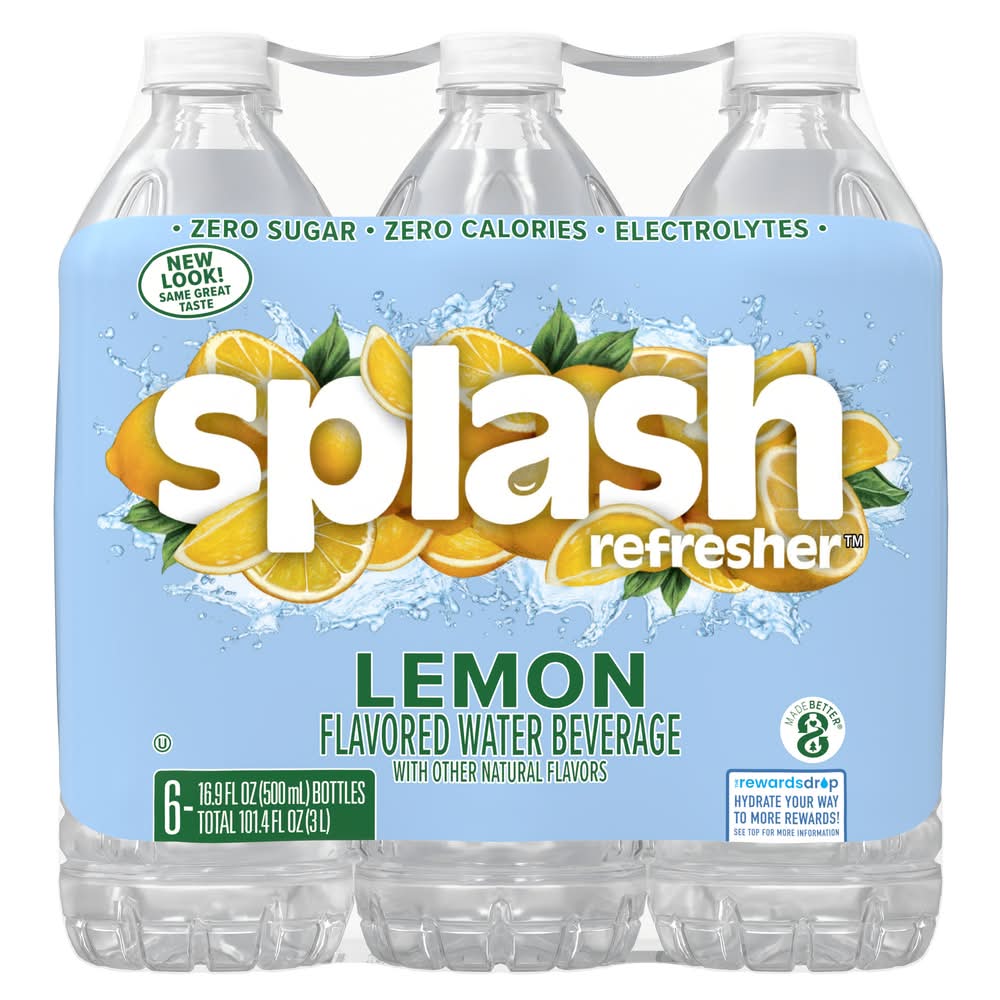 Water doesn’t have to be boring. Do yourself a flavor and hydrate with delicious, Lemon flavored Splash Refresher. It’s the perfect hydration beverage when you are looking for something that’s like water – but actually good. The classically clean flavor of lemon with just a hint of sweetness in Splash Refresher Lemon flavored water beverage is truly a slice above boring. So quench your thirst and tease your taste buds any time of day with Splash Refresher. With zero calories and zero sugar, this craveable, better-for-you-beverage is a guilt-free, great-tasting substitute to bottled water and the refreshiest alternative to other sugary beverages and high-calorie drinks. Now that’s sweet. Say hello to Splash Refresher – your body and taste buds will thank you. Splash Refresher bottled water beverage is available in a range of sizes and flavors to help you stay hydrated throughout the day. Hydration may be mandatory - but boring never is. Grab a 6 pack of your new favorite flavored water beverage and hydrate happy. • Flavor: Lemon • Pack size: 6 • Bluetriton brands, inc., Stamford CT 06902 • Packaging: Reusable