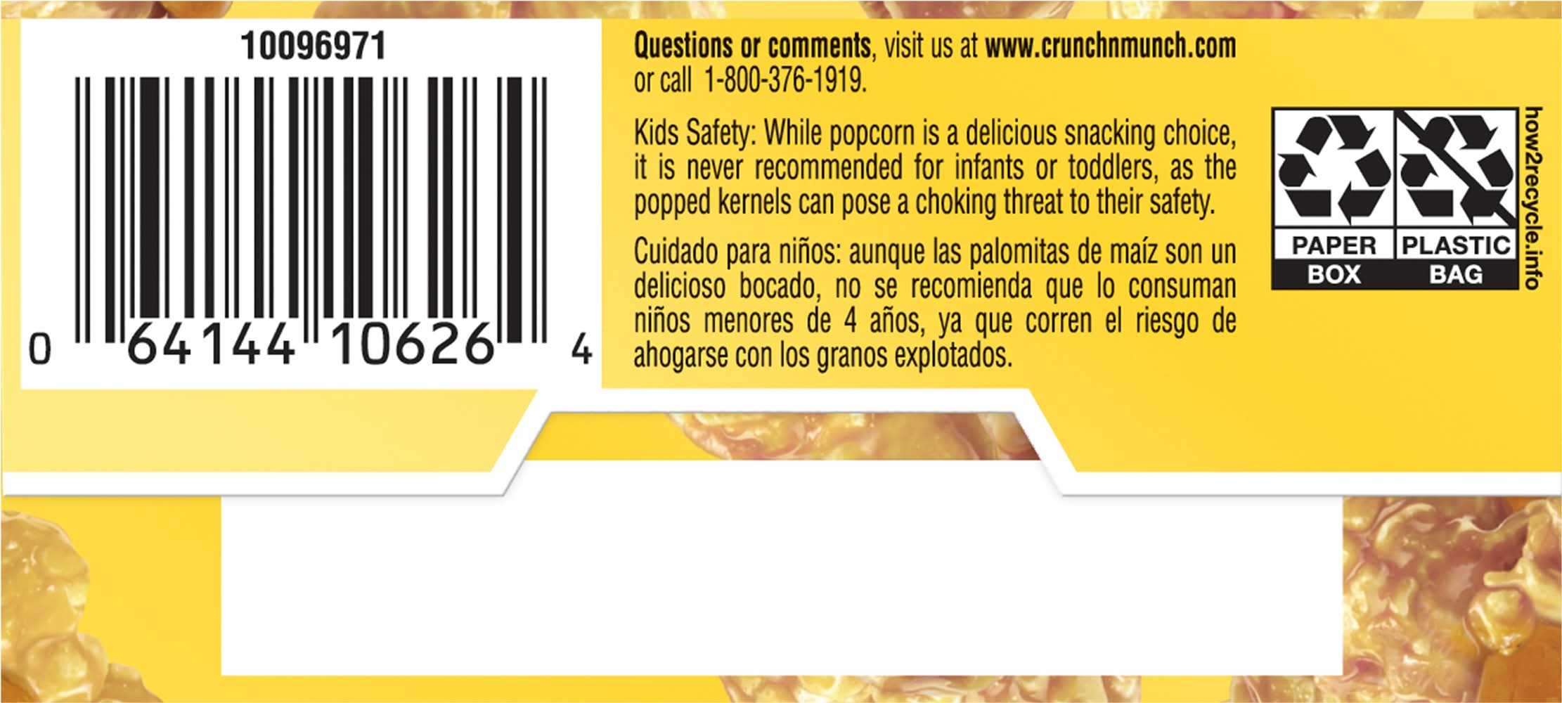 Whole grain popcorn and crunchy peanuts are covered in decadent caramel and packaged in a portable box so you always have a salty sweet snack on hand. CRUNCH ‘N MUNCH is made with 100% whole grain popcorn. This individual-size package of gourmet popcorn makes the perfect companion for sporting events, road trips and picnics at the park. • Flavor: Caramel • Conagra Global Instance - ProductXM, PO Box 3534,Chicago,IL,60654 • Packaging: Reusable