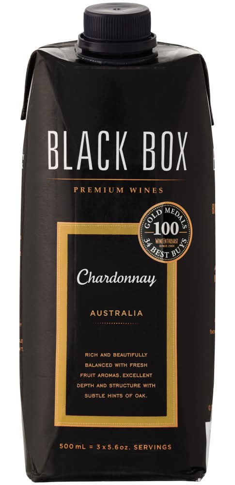 Made from grapes harvested in world-class appellations, Black Box award-winning wines hail from California?s famed wine country and the acclaimed vineyards of Argentina and Chile. Through a meticulous, traditional winemaking process, each wine is crafted to be food-friendly and fruit-forward?without the expense and fuss of bottled wines. This delightful chardonnay features a fresh citrus aroma and a rich palate boasting tropical mango and pineapple aromas, with subtle hints of oak. It pairs well with grilled chicken, white fish, and soft cheese. The 500-milliliter box makes it a convenient choice to take with you. • Alcohol by volume: 13.5% • 2014 • Black Box Wines, Lathrop, CA