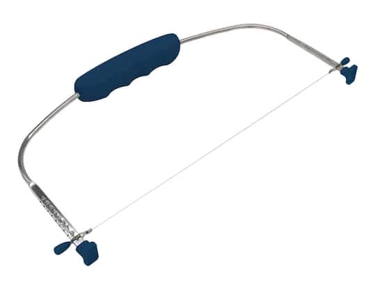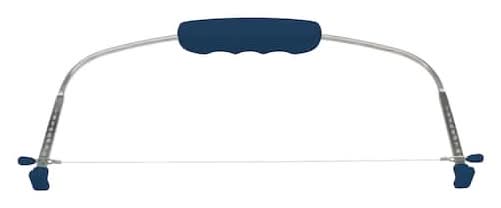 This cake leveler can be used to precisely level cakes for even layers. Food safe. Thermoplastic rubber, stainless steel, plastic. Before first and after each use, hand wash in warm, soapy water. Rinse and dry thoroughly • Color: Blue • Size: 13.1x6.9x0.8 in