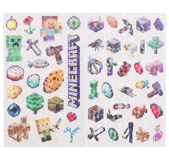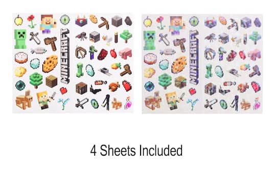 These Minecraft stickers are perfect for your paper crafting projects. Sheets: 4 (2 prismatic sheets, 2 normal sheets) . Material: Paper and adhesive . Age: For ages 3 and up Size: 4" x 8"
