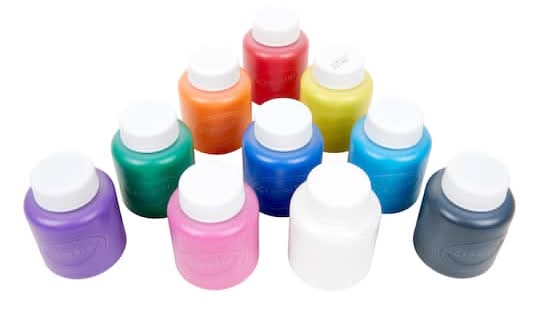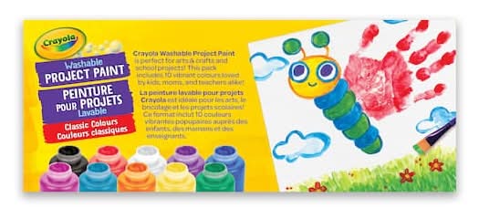 Buy this Crayola Washable Project Paint Set, 10ct. at Michaels. These paints are easy to apply with brushes, sponges, stamps, stencils and other tools, and they can be used on almost any surface. Includes assorted colors. 2 fl. oz. (59 mL) jar size . 10 jars . Washes from skin and most washable clothing . Multi surface use . Safe and nontoxic . Crayola Washable Project Paint Set, 10ct. Color: Multicolor