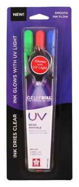 Our UV ink dries clear and can be seen only under UV light, where the ink glows beautifully in 3 luminous Includes assorted UV colors. Medium point Includes UV keychain flashlight. Color: Green-red-blue