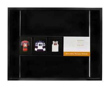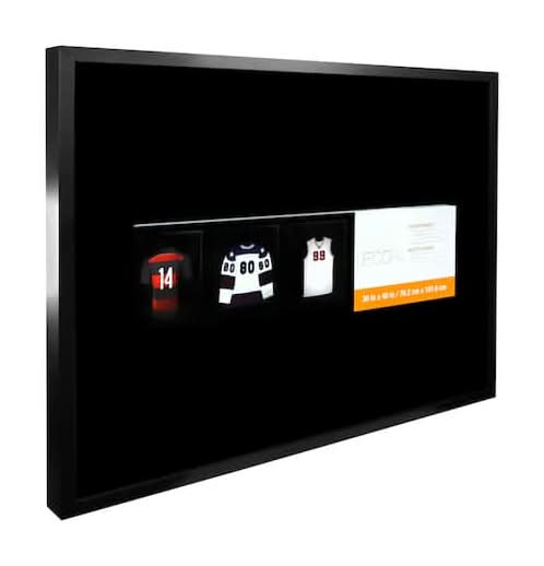 Extra large shadow box is perfect for displaying a sports jersey, cheerleading uniform, school pennant, photographs and other keepsakes that require a lot of space. Black finish exterior. Black velour backing. 30" x 40" opening. 2" working depth. Easy back loading. Includes hanging hardware. • Color: Black • Size: 30x40 In