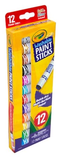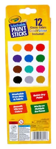 Crayola Quick Dry Paint Sticks come in assorted classic colors, including gold and silver, offering a vibrant selection for various artistic projects. Each color is washable, allowing for easy removal from skin and most washable clothing. These paint sticks are crafted to provide full coverage and are compatible with multiple surface types. They dry quickly, typically in seconds when applied to poster board, and require no water, setup, or cleanup. Designed for convenience, the paint sticks can be easily recapped and stored after use. They are safe, nontoxic, and appropriate for users aged three and up.