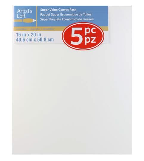 Purchase the 5 Pack 16" x 20" Super Value Canvas by Artist's Loft at Michaels. This value pack of five canvases is suitable for all oil, tempera and acrylic painting. White. 16" x 20" (40.64cm x 50.8cm). 1.1875" x 0.625" (3.01cm x 1.587cm) wooden frame. 5 canvases. Acrylic gesso primed. Lightweight cotton duck. 5 Pack 16" x 20" Super Value Canvas by Artist's Loft • Color: White • Size: 16x20 in