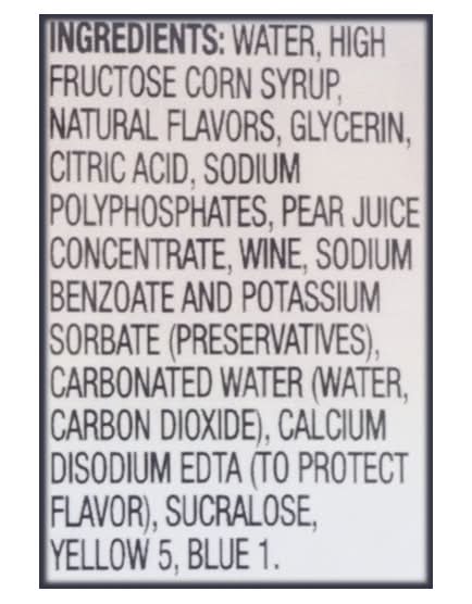 Ingredients: Water, High Fructose Corn Syrup Natural Flavors, Glycerin, Citric Acid, Sodium Polyphosphates, Pear Juice Concentrate, Wine, Sodium Benzoate and Potassium Sorbate (Preservatives) Carbonated Water (Water, Carbon Dioxide), Calcium Disodium EDTA (to Protect Flavor), Sucralose, Yellow 5, Blue 1.