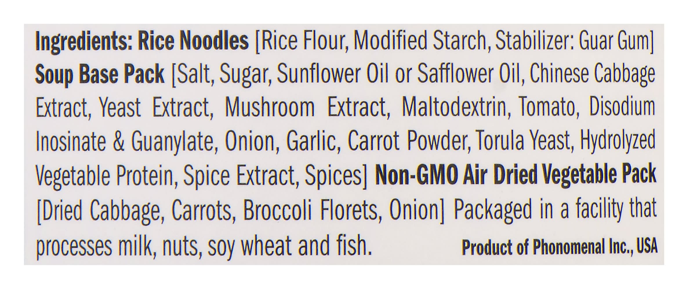 Ingredients: Rice Noodles [Rice Flour, Modified Starch, Stabilizer: Guar Gum]. Soup Base Pack [Salt, Sugar, Sunflower Oil or Safflower Oil, Chinese Cabbage Extract, Yeast Extract, Mushroom Extract, Maltodextrin, Tomato, Disodium Inosinate & Guanylate, Onion, Carrot Powder, Torula Yeast, Hydrolyzed Vegetable Protein, Spice Extract, Spices]. Non-GMO Air Dried Vegetable Pack [Dried Cabbage, Carrots, Broccoli Florets, Onion] Contains: Milk, Tree Nuts, Soybeans, Wheat, Fish