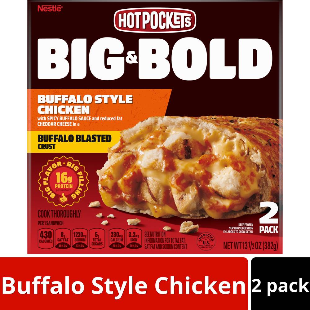 Buffalo style chicken with spicy buffalo sauce and reduced fat cheddar cheese in a buffalo blasted crust. Per 1 Sandwich: 390 calories; 5 g sat fat (25% DV); 1170 mg sodium (49% DV); 4 g sugars; 18 g protein (32% DV); calcium (20% DV). See nutrition information for total fat, sat fat & sodium content. High protein. Nutritional Compass: Nestle - Good food, good life. Thoughtful portion. 1 portion = 1 sandwich. Enjoy with a side salad or fresh fruit. Talk to Us: Tell to Us: Tell us more at 50% larger as compared to a standard Hot Pocket with 18 g protein per sandwich. Satisfying bigger cravings with big & bold. Made with 100% real cheese. Inspected for wholesomeness by U.S. Department of Agriculture. • Brand: Hot pockets • Pack size: 2 • Packaging: Reusable
