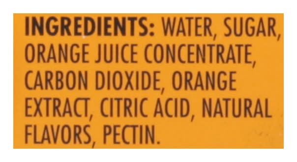 Ingredients: Ingredients:WATER, ORANGE JUICE FROM CONCENTRATE, SUGAR, CARBON DIOXIDE, CITRIC ACID, NATURAL FLAVOR.