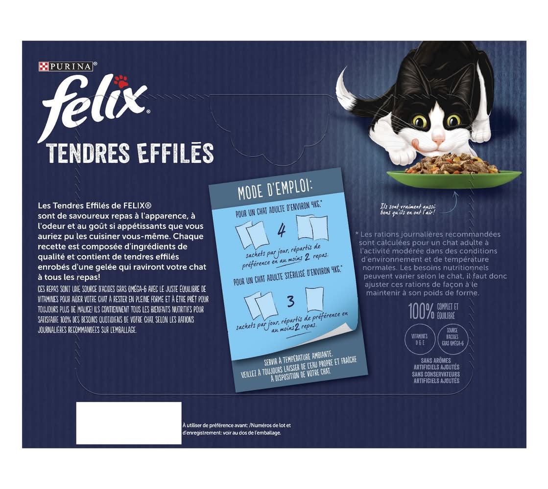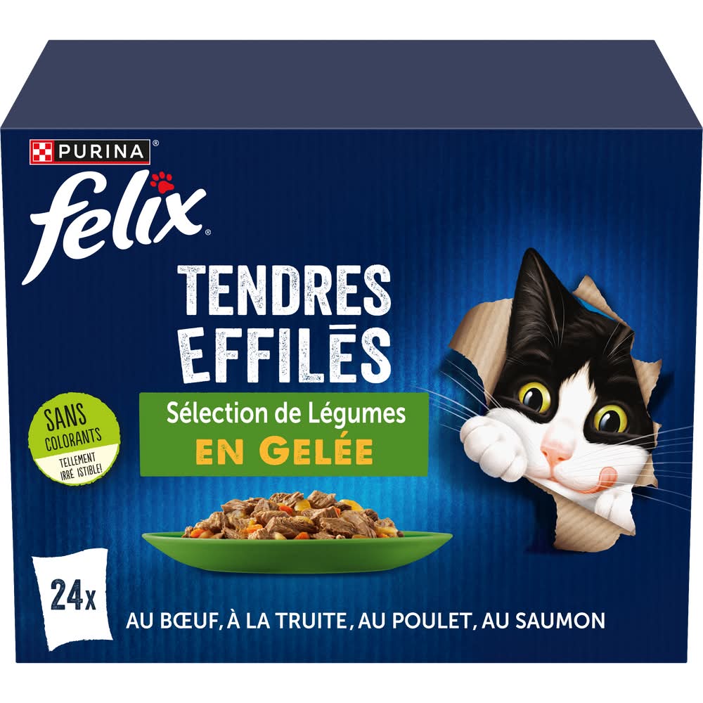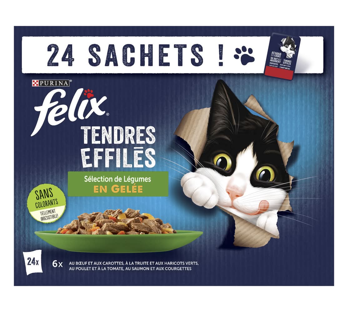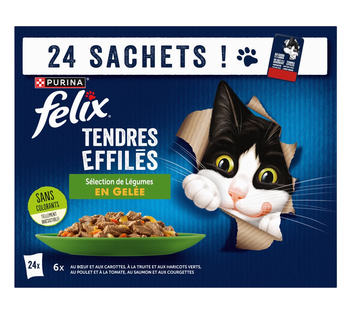 C'est si bon d'être un chat, surtout au moment des repas ! Faites plaisir à votre petit coquin avec la texture alléchante et les délicieuses saveurs de FELIX Aussi Bon que Beau. Il contient tout ce dont votre chat a besoin pour rester en bonne santé et actif. Chaque recette est spécialement préparée avec de tendres effilés enrobés d'une délicieuse gelée, avec des ingrédients de haute qualité qui raviront votre chat à tous les repas. Ils sont vraiment aussi bons qu'ils en ont l'air ! Et ce n'est pas tout ! FELIX est disponible dans une large gamme de recettes savoureuses. FELIX, tellement irrésistible !