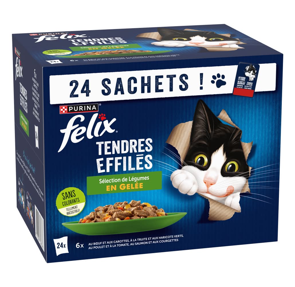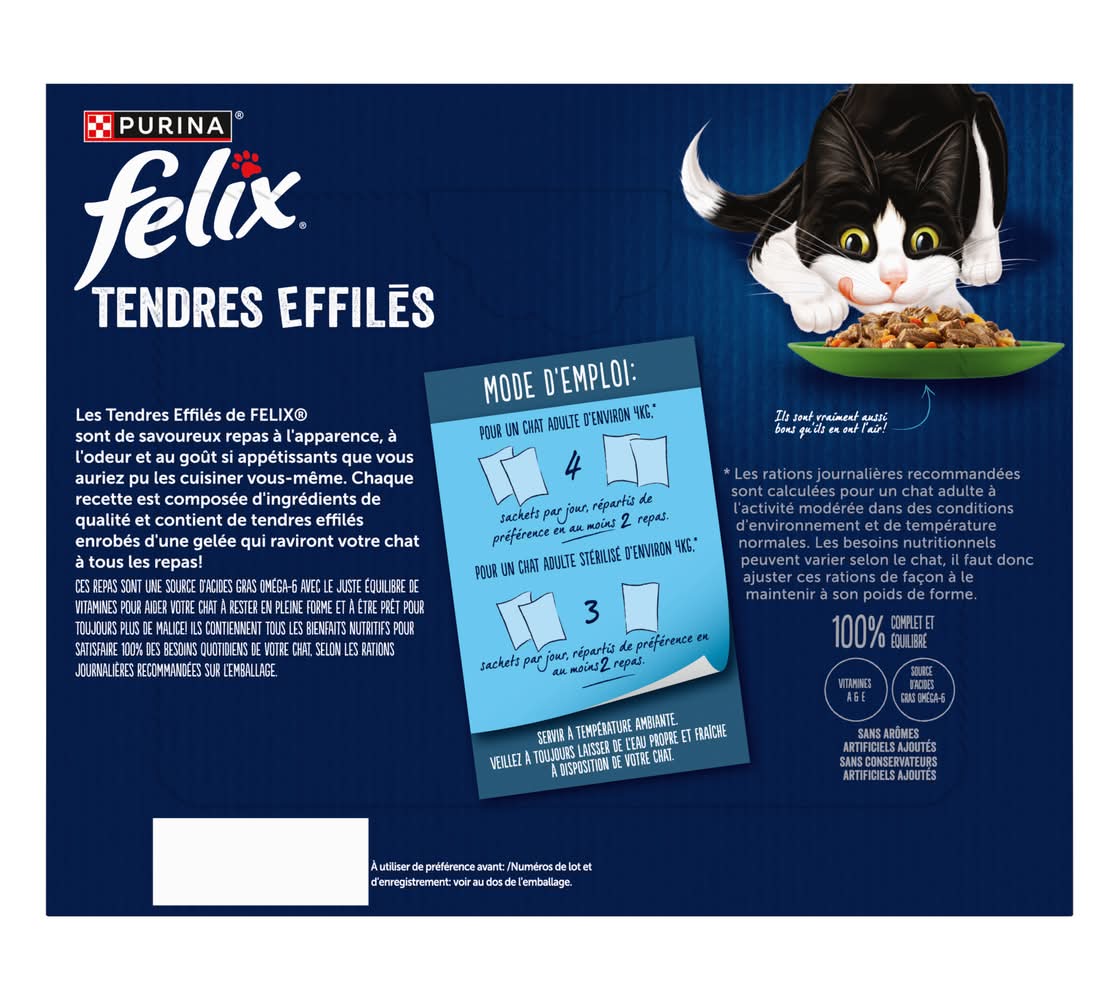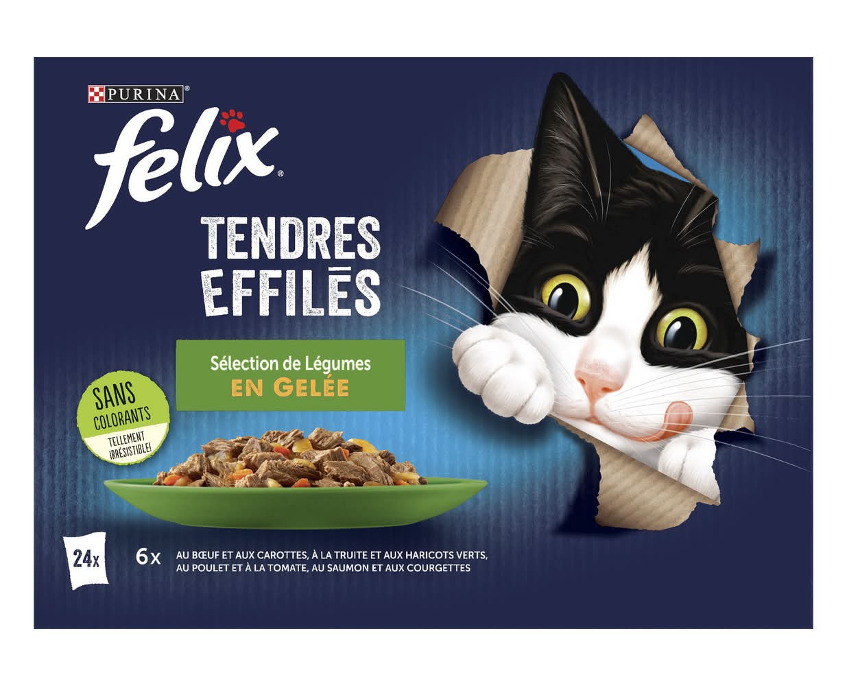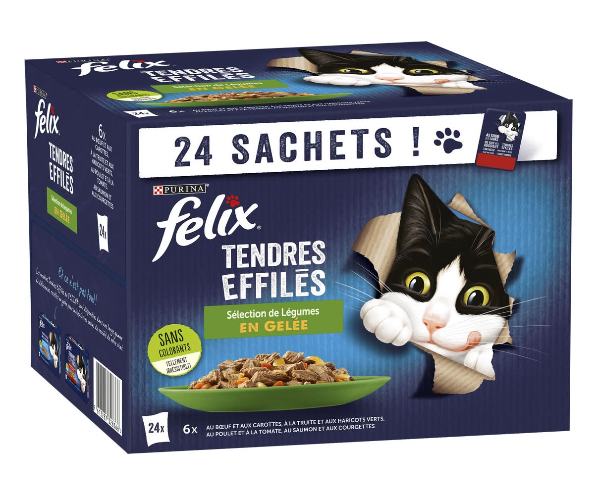 C'est si bon d'être un chat, surtout au moment des repas ! Faites plaisir à votre petit coquin avec la texture alléchante et les délicieuses saveurs de FELIX Aussi Bon que Beau. Il contient tout ce dont votre chat a besoin pour rester en bonne santé et actif. Chaque recette est spécialement préparée avec de tendres effilés enrobés d'une délicieuse gelée, avec des ingrédients de haute qualité qui raviront votre chat à tous les repas. Ils sont vraiment aussi bons qu'ils en ont l'air ! Et ce n'est pas tout ! FELIX est disponible dans une large gamme de recettes savoureuses. FELIX, tellement irrésistible !