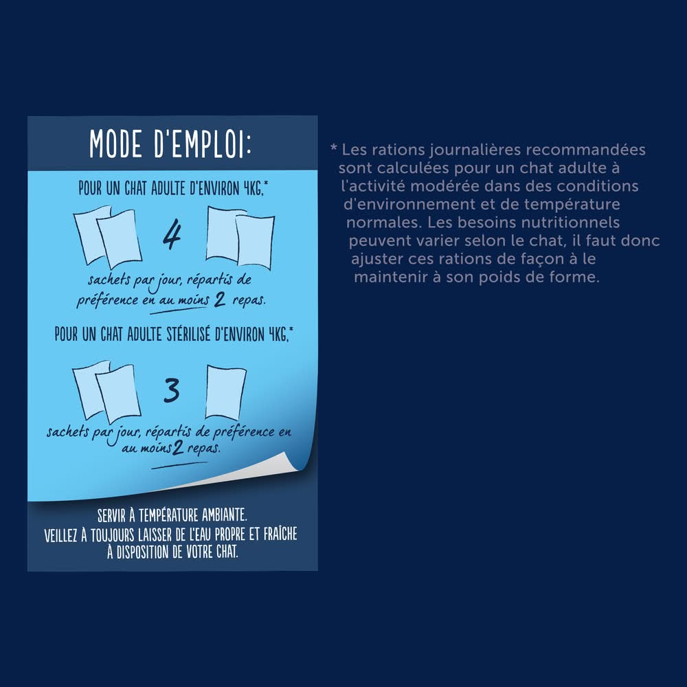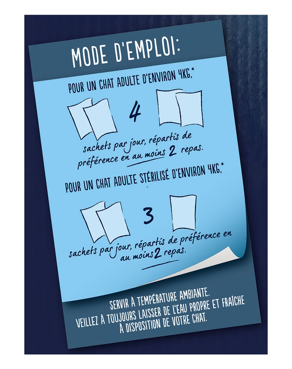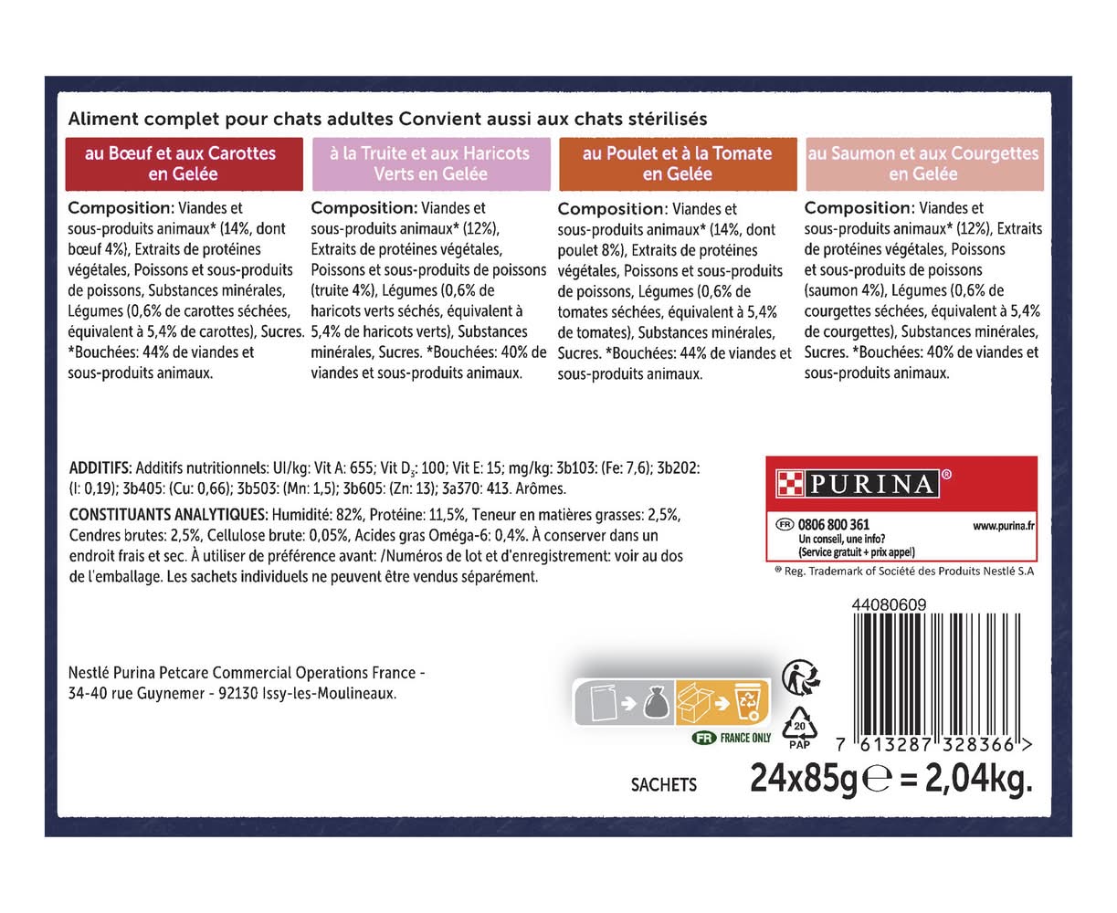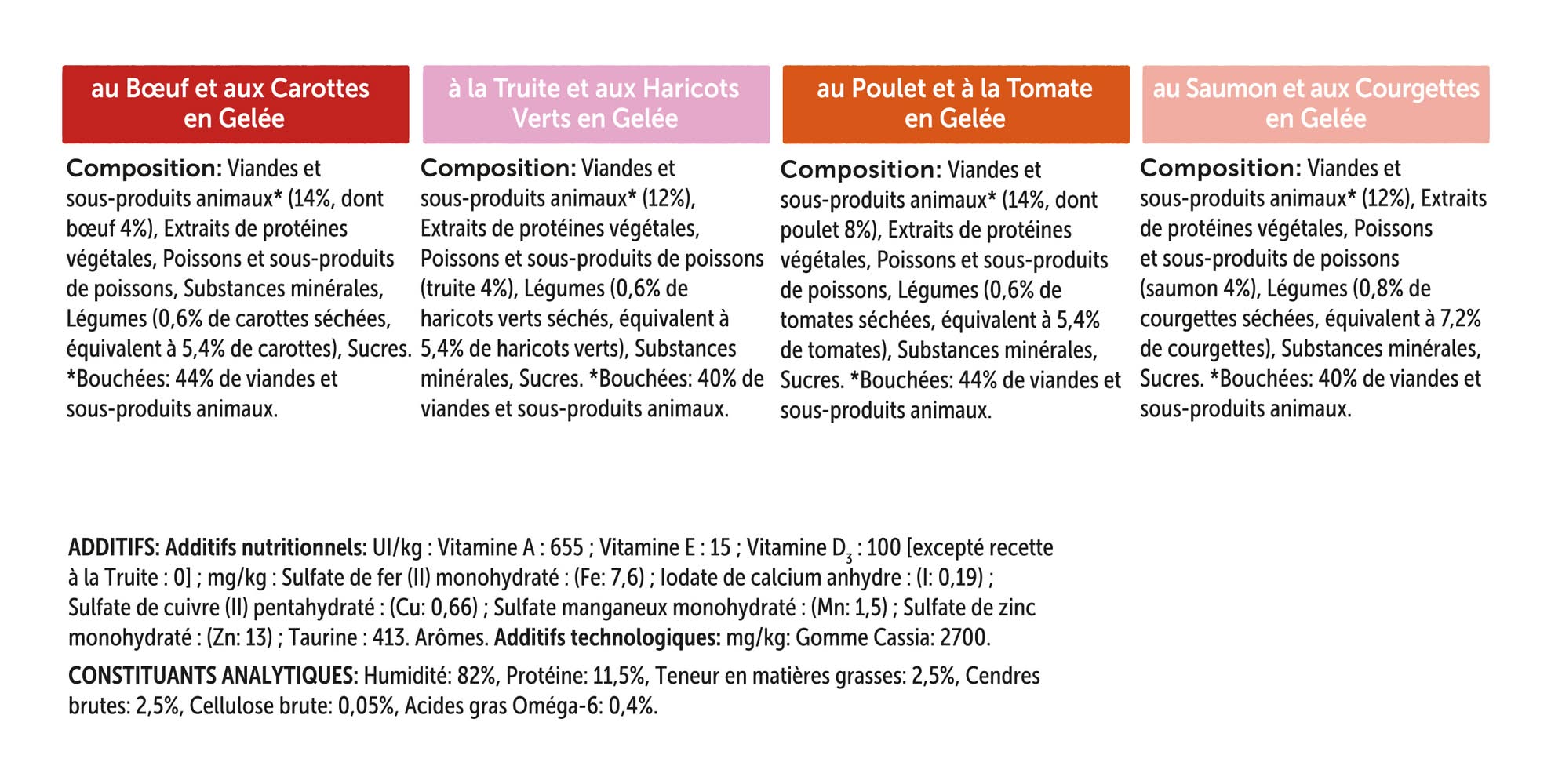 Ingredients: Composition: Viandes et sousproduits animaux (12 %), Extraits de protéines végétales, Poissons et sousproduits de poissons (truite 4%), Légumes (0.6 % de haricots verts séchés, équivalent à 5.4% de haricots verts), Substances minérales, Sucres. Bouchées : 40% de viandes et sousproduits animaux. Composition: Viandes et sousproduits animaux (12 %), Extraits de protéines végétales, Poissons et sousproduits de poissons (saumon 4%), Légumes (0.8 % de courgettes séchées, équivalent à 7.2% de courgettes), Substances minérales, Sucres. Bouchées : 40% de viandes et sousproduits animaux. Composition: Viandes et sousproduits animaux (14 %, dont bœuf 4%), Extraits de protéines végétales, Poissons et sousproduits de poissons, Substances minérales, Légumes (0.6 % de carottes séchées, équivalent à 5.4% de carottes), Sucres. Bouchées : 44% de viandes et sousproduits animaux. Composition: Viandes et sousproduits animaux (14 %, dont poulet 8%), Extraits de protéines végétales, Poissons et sousproduits de poissons, Substances minérales, Légumes (0.6 % de tomates séchées, équivalent à 5.4% de tomates), Sucres. Bouchées : 44% de viandes et sousproduits animaux. Additives: Additifs : Additifs nutritionnels :UI/kg : Vitamine A : 720 ; Vitamine E : 16 ;mg/kg : Sulfate de fer (II) monohydraté : (Fe: 8, 3) ; Iodate de calcium anhydre : (I: 0, 31) ; Sulfate de cuivre (II) pentahydraté : (Cu: 0, 72) ; Sulfate manganeux monohydraté : (Mn: 1, 6) ; Sulfate de zinc monohydraté : (Zn: 15) ; Taurine : 453. Additifs technologiques :mg/kg : Gomme Cassia : 2700. Arômes.