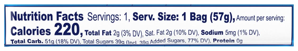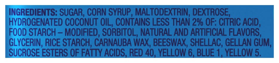 Ingredients: Sugar, Glucose Syrup, Maltodextrin, Dextrose, Hydrogenated Coconut Oil, Contains Less than 2% of: Citric Acid, Modified Corn Starch, Sorbitol, Glycerol, Artificial Flavors, Carnauba Wax, Rich Starch, Beeswax, Shellac, Gellan Gum, Sucrose Fatty Acid Esters, Artificial Colors, Red 40, Yellow 6, Blue 1, Yellow 5. Contains: Tree Nuts, Coconuts, Corn