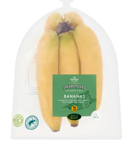 are fresh fruit offerings sourced to meet quality standards. These bananas can be enjoyed in a variety of culinary applications, from a nutritious snack to a versatile ingredient in baking and cooking. • Pack size: 5 • Wm Morrison Supermarkets PLC, Gain Lane,Bradford,BD3 7DL. • Packaging: Reusable