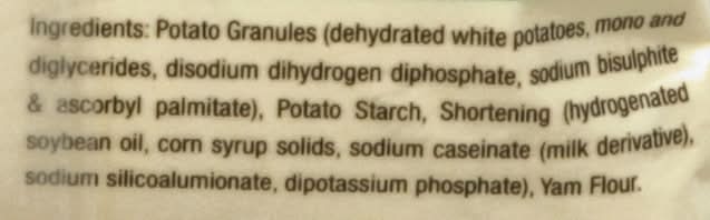 Ingredients: Potato Granules (Dehydrated White Potatoes, Mono and Diglycerides, Disodium Dihydrogen Diphosphate, Sodium Bisulphite & Ascorbyl Palmitate), Potato Starch, Shortening (Hydrogenated Soybean Oil, Corn Syrup Solids, Sodium Caseinate [Milk Derivative], Sodium Silicoalumionate, Dipotassium Phosphate), Yam Flour Contains: Soybeans, Milk